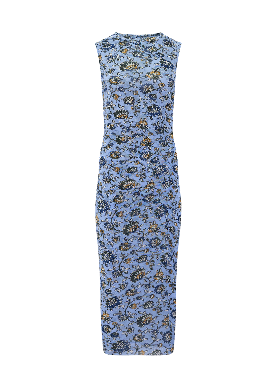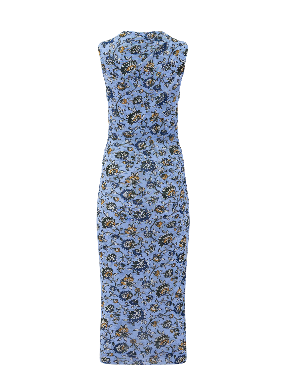 Elegant, yet effortless. Crafted from a super-stretch blend, the Sylviani dress is a form-fitting sleeveless bodycon midi in sky blue, printed with a warm floral motif throughout. Ruching from shoulder to hip creates soft folds for a beautifully draped silhouette, while a mock neckline adds a refined finish. The perfect dress for date nights or special events—just add a strappy heel and go.