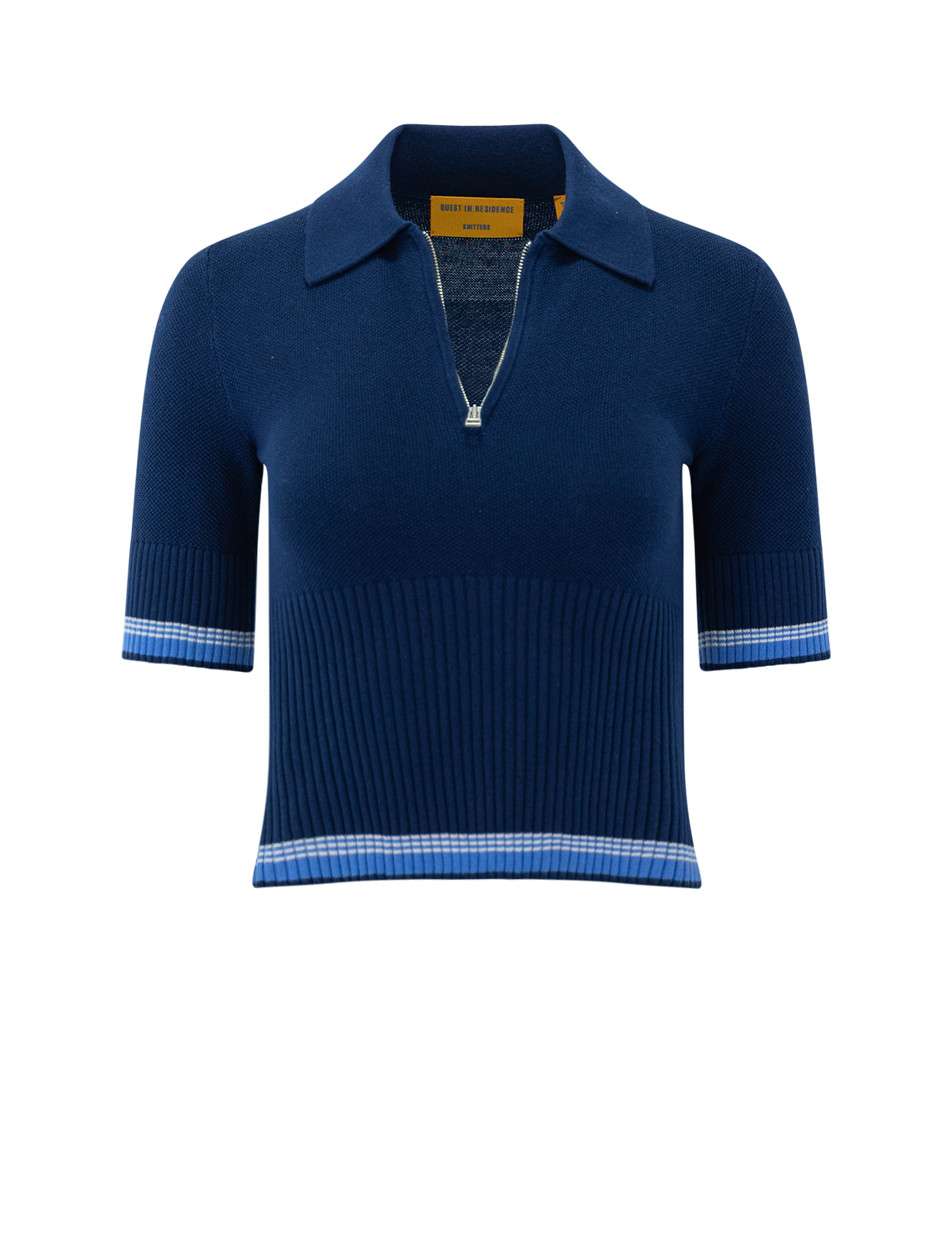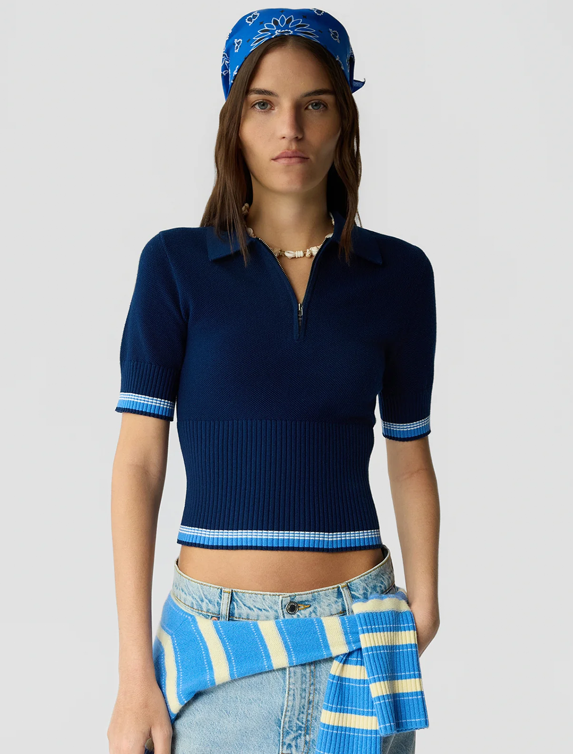 The Marcella Polo is a women’s light-weight cotton–cashmere polo featuring a textured piqué stitch with a sporty half-zip neckline and striped rib trim. Versatile and breathable, this knit polo delivers a modern sporty-prep look that pairs effortlessly with denim or layers neatly under other knits for everyday wear.