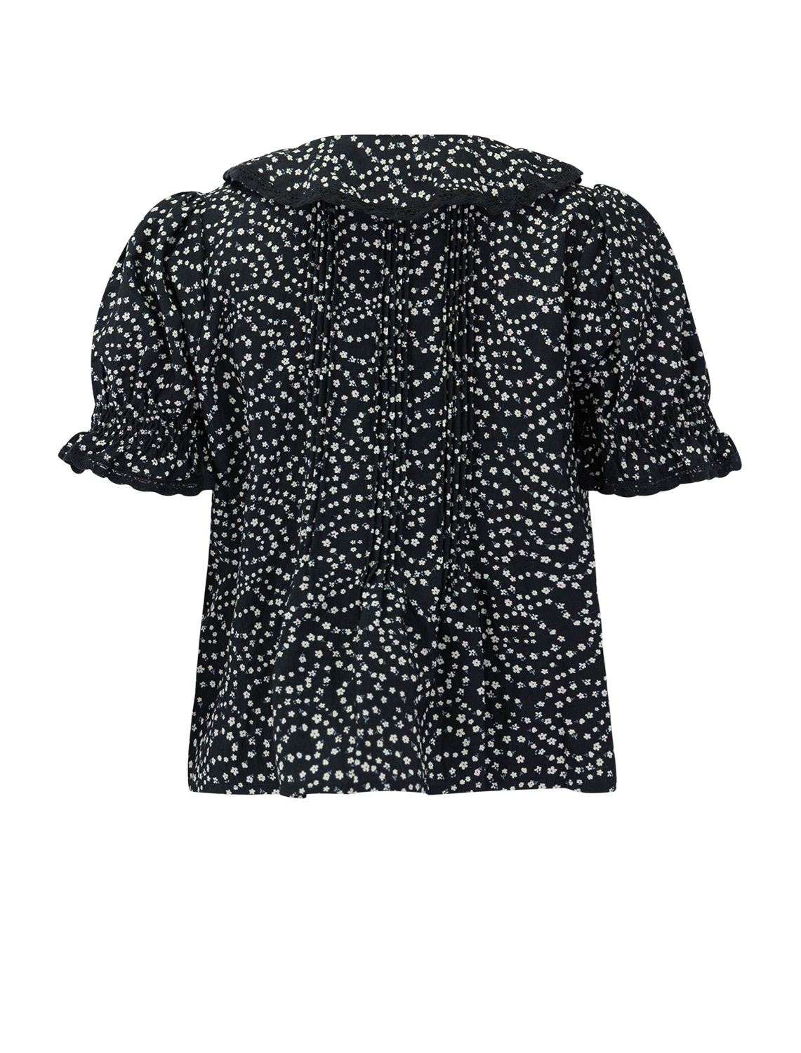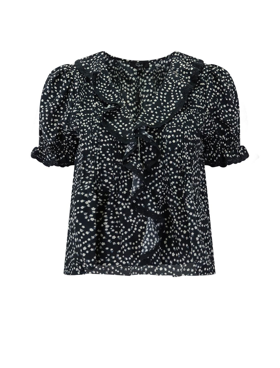 Lace trims the frilly collar, placket and cuffs of this easygoing top in an allover floral print.