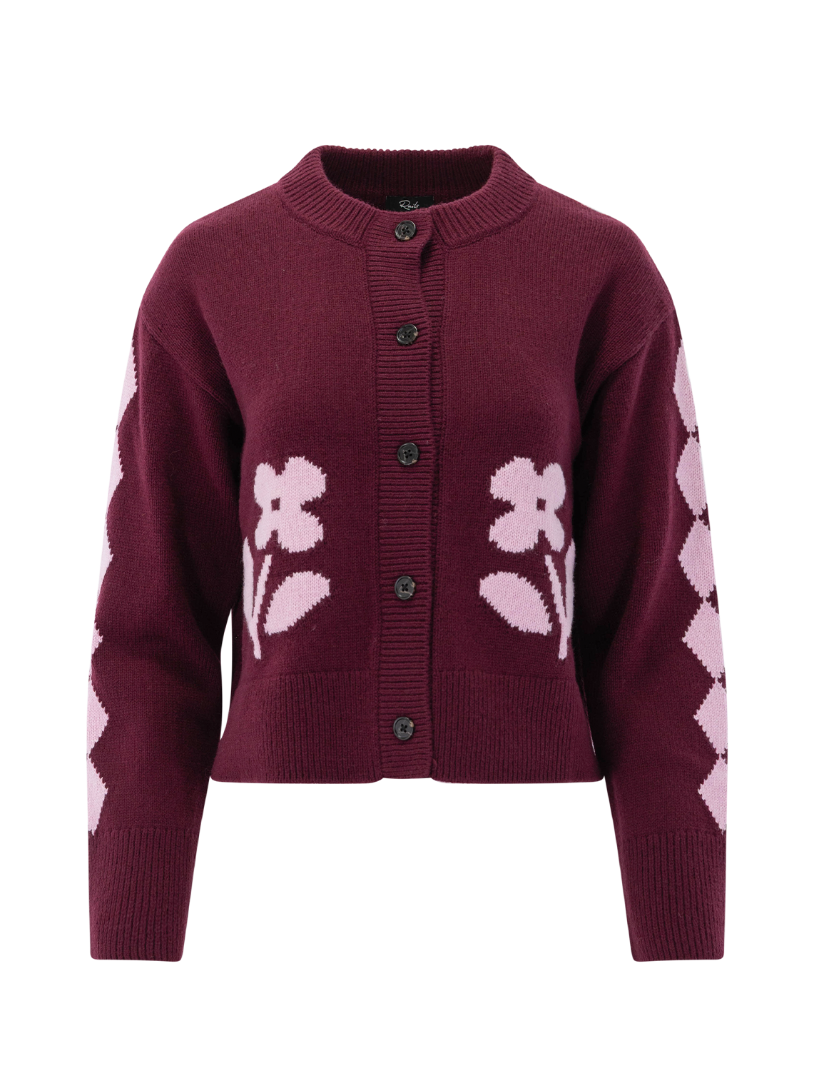 The Mavie blends classic charm with modern comfort. This relaxed-fit wool-blend cardigan features delicate front floral motifs and diamond detailing along the sleeves, with long sleeves and front button closures.