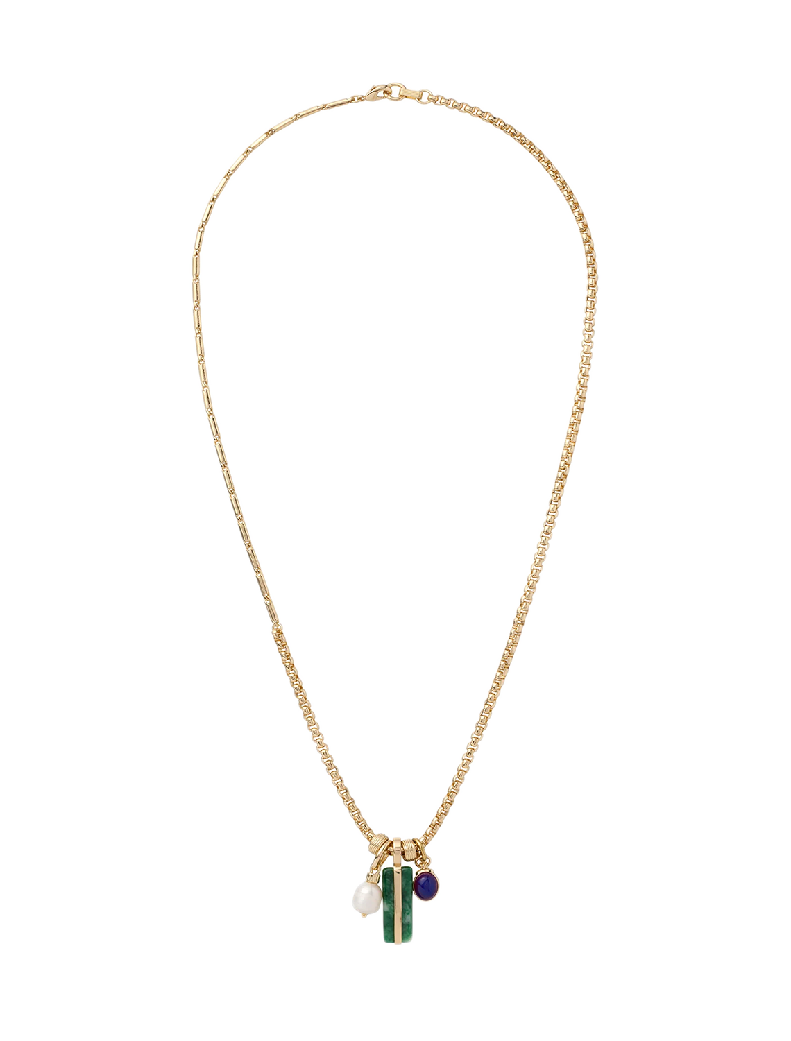 - charms: freshwater pearl, moss agate, cabochon lapis