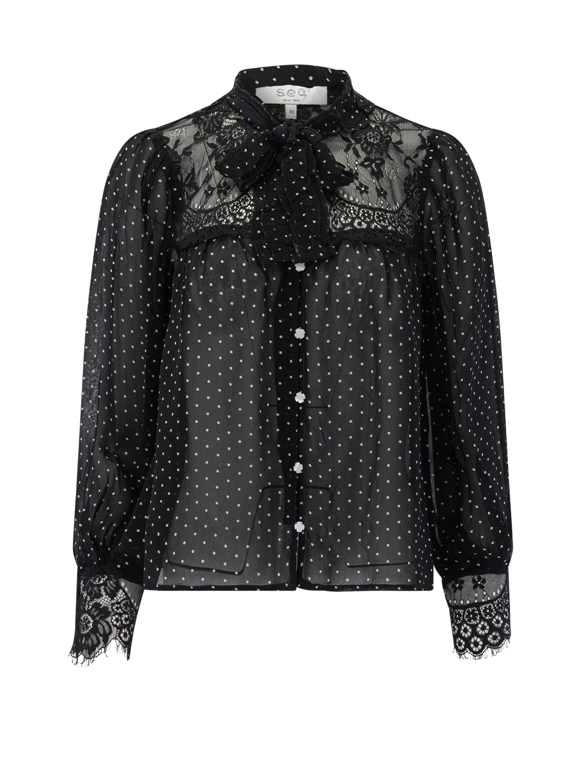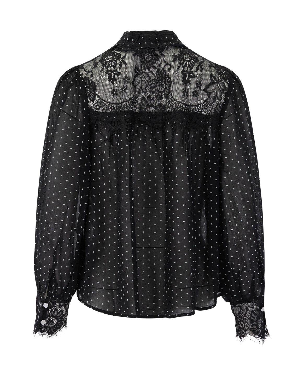 The Melody polka dot top features voluminous sleeves softened by delicate lace inserts. Floral buttons and a self-tie closure at the neck add subtle, feminine touches.