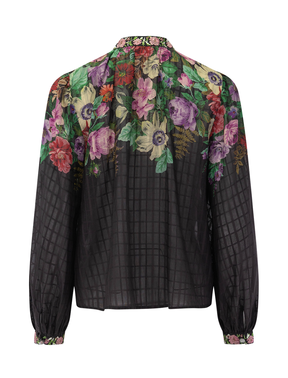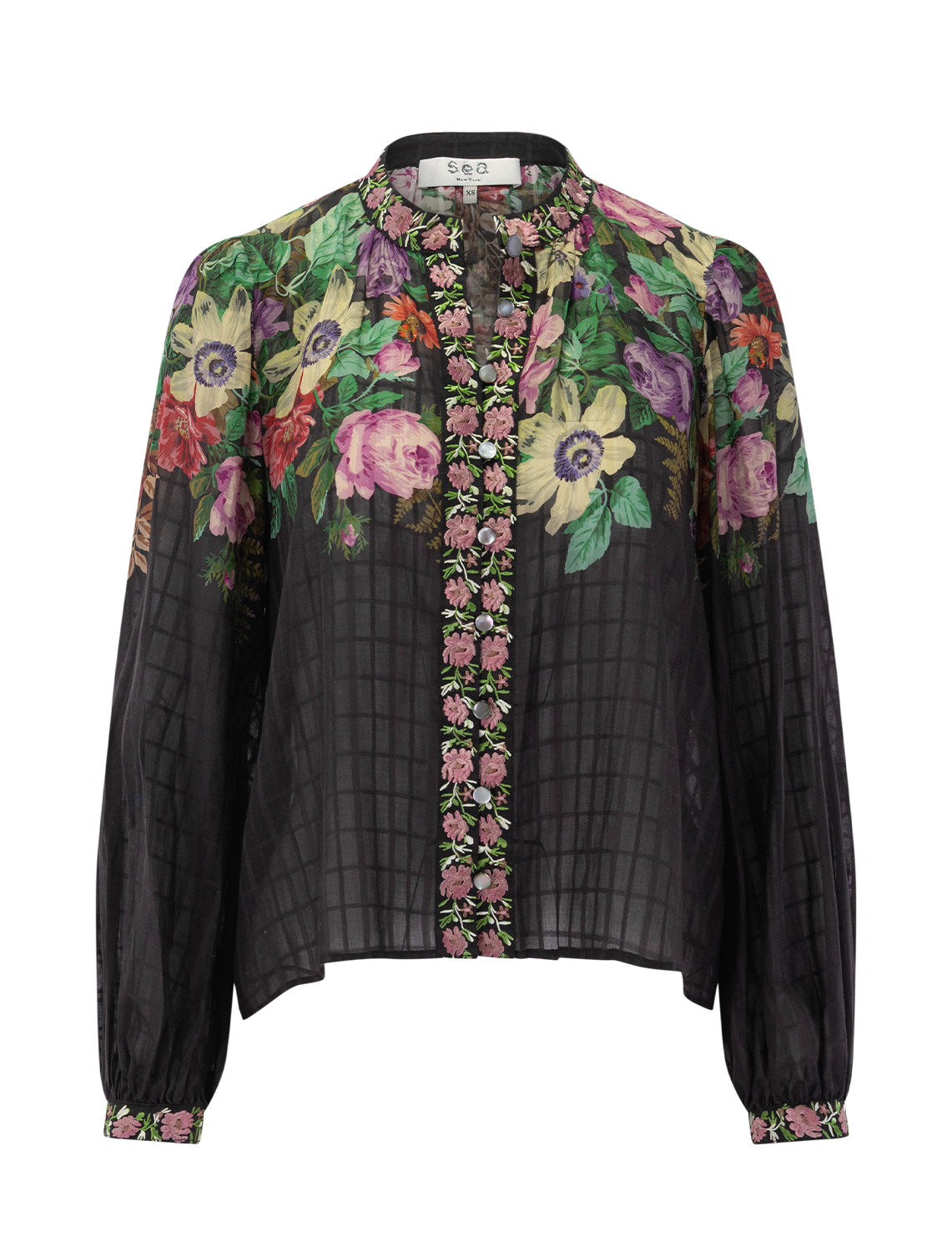 The Viktoria floral-print top features voluminous long sleeves and bold floral motif, evoking effortless femininity. The floral embroidered trim lends a romantic accent to the silhouette.