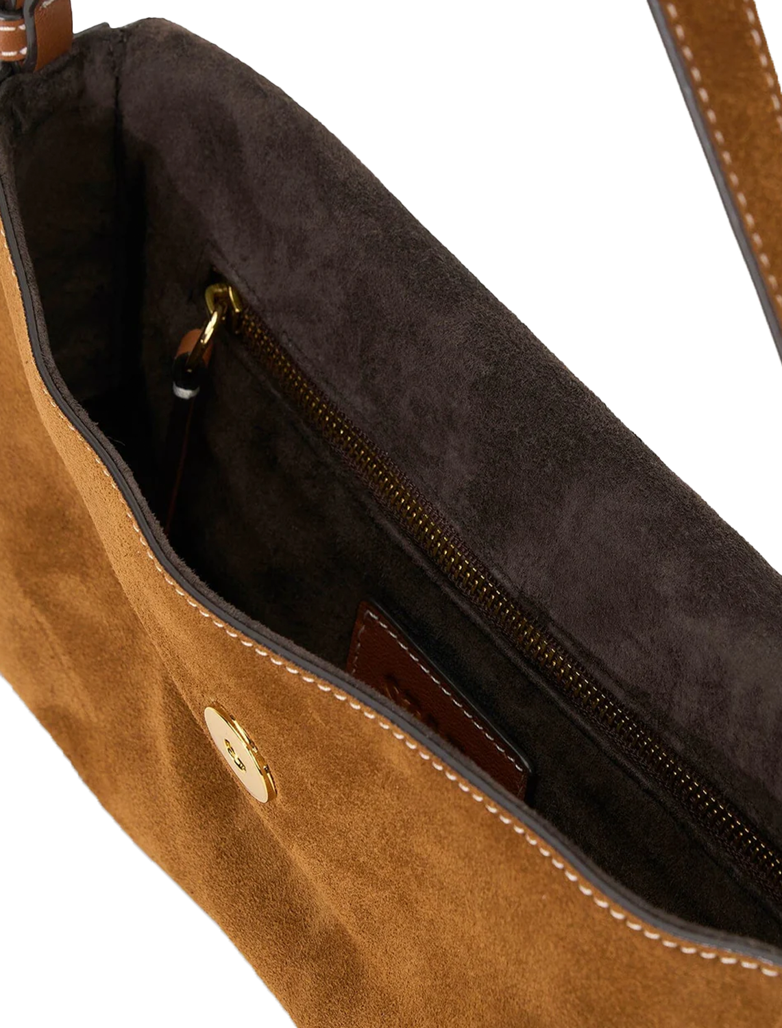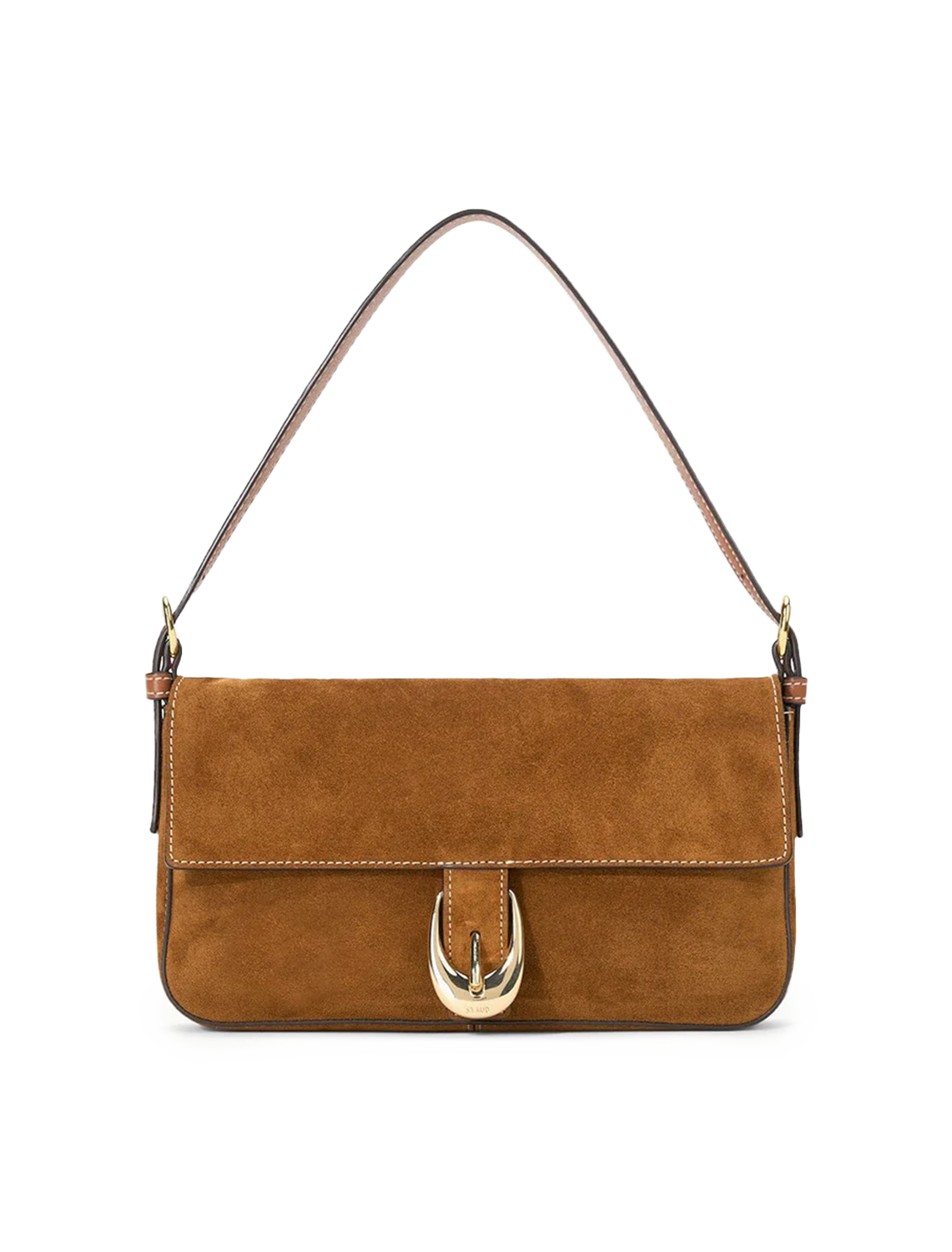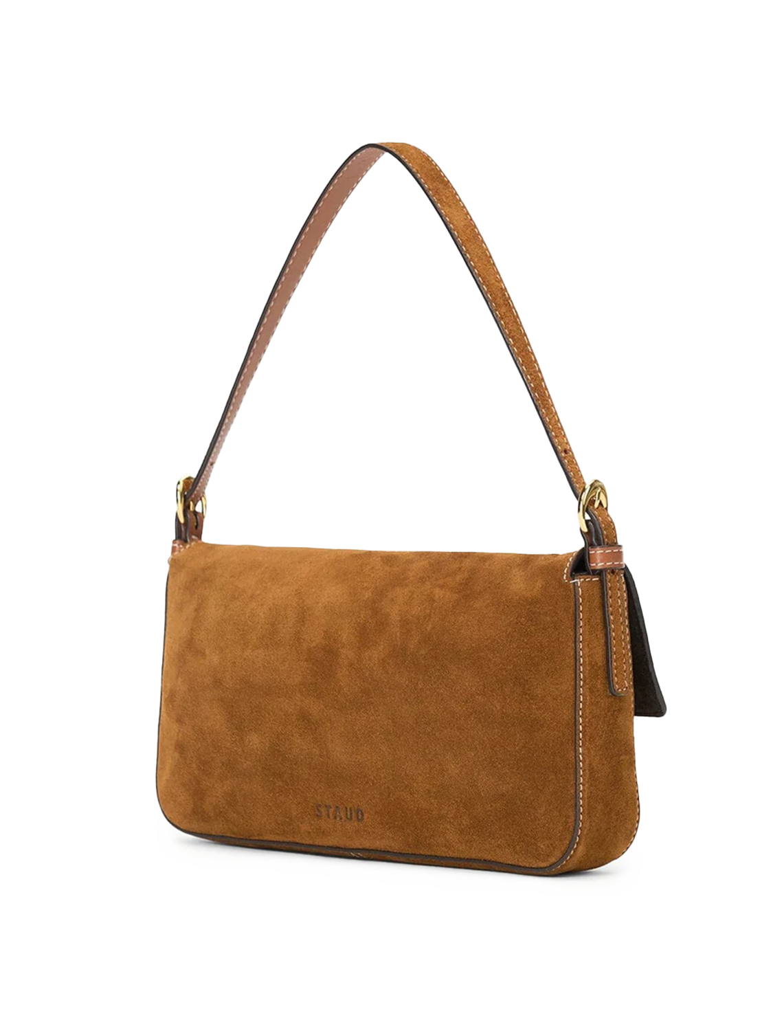 The Harlow Bag is Staud's newest shoulder bag, featuring the brand's signature Moon buckle hardware. This style features a center front Moon buckle, and has a snap closure and interior pocket.
