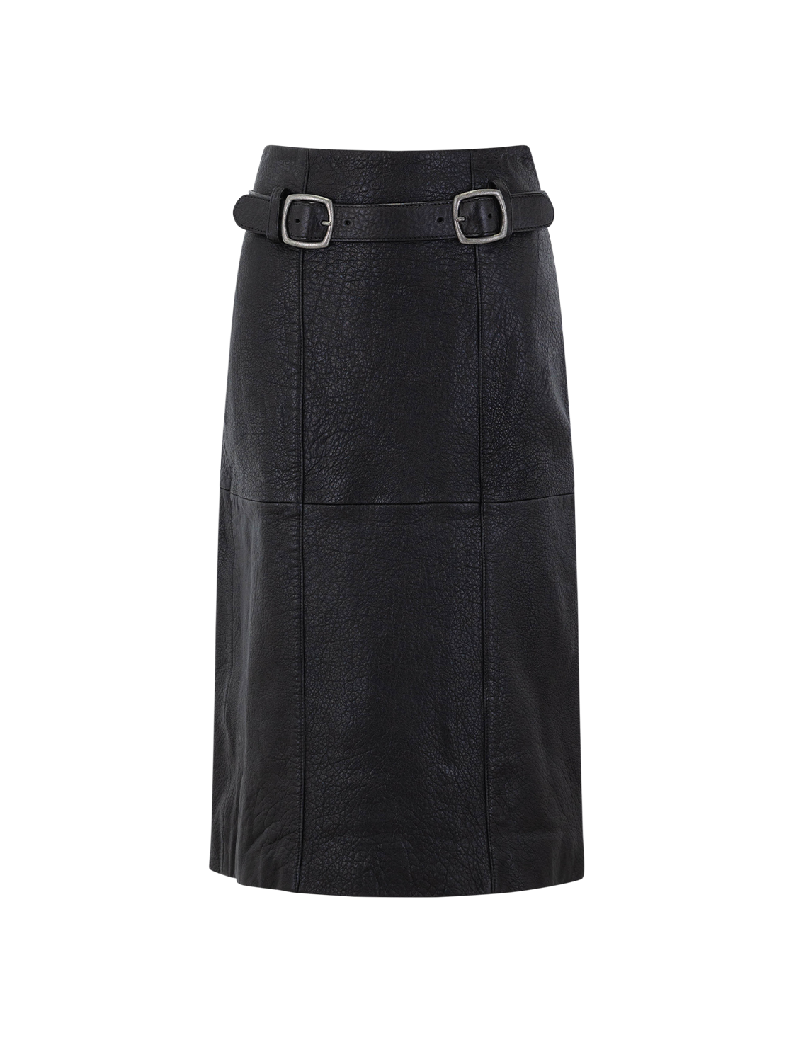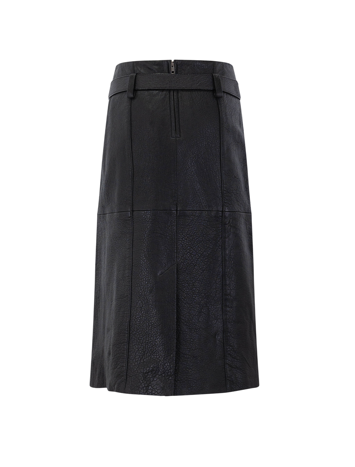 The Gwen leather skirt is crafted from supple leather in a sleek midi silhouette. It's finished with a removable belt, offering versatile styling and a polished, modern edge.