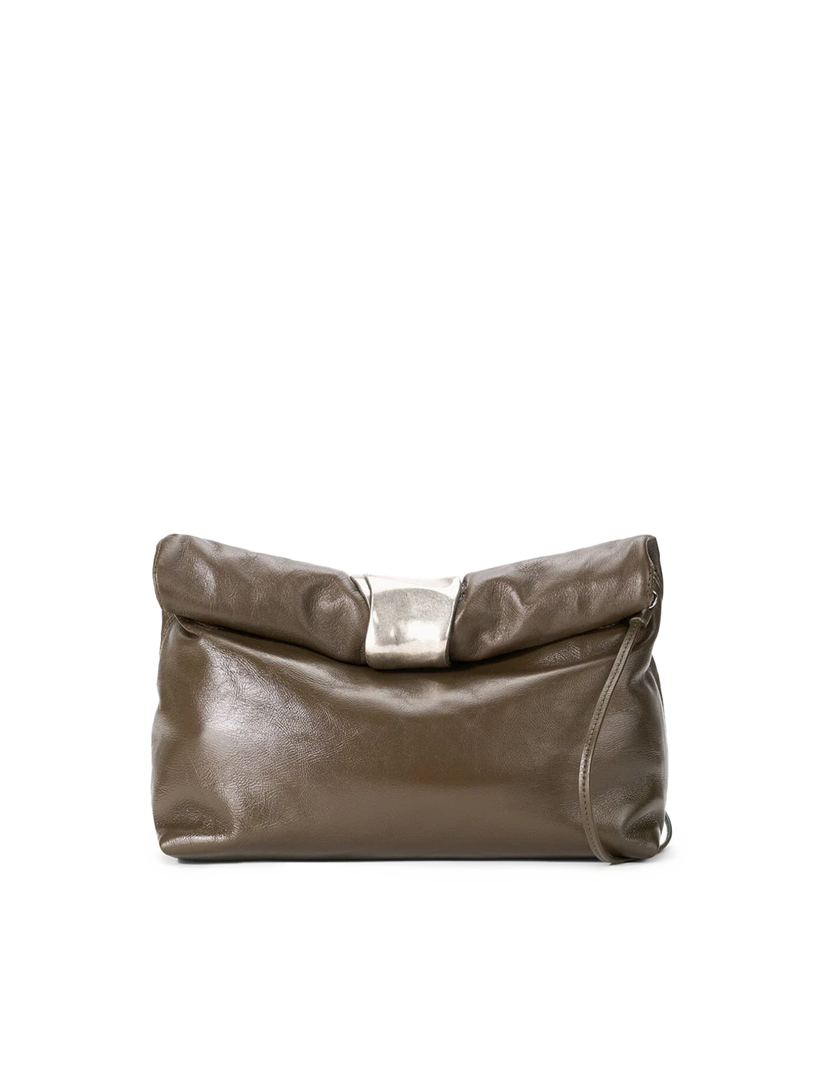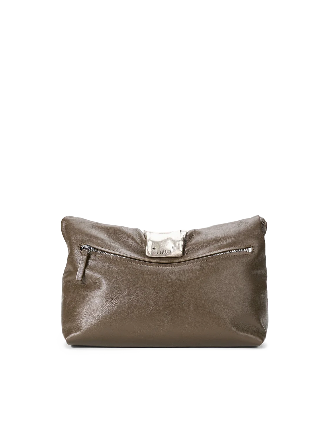 The Cuff Clutch is a slouchy clutch featuring Staud's new organic draped metal cuff hardware. The clutch's interior is easily accessed through the zipper opening at the back and includes a detachable thin leather shoulder strap.
