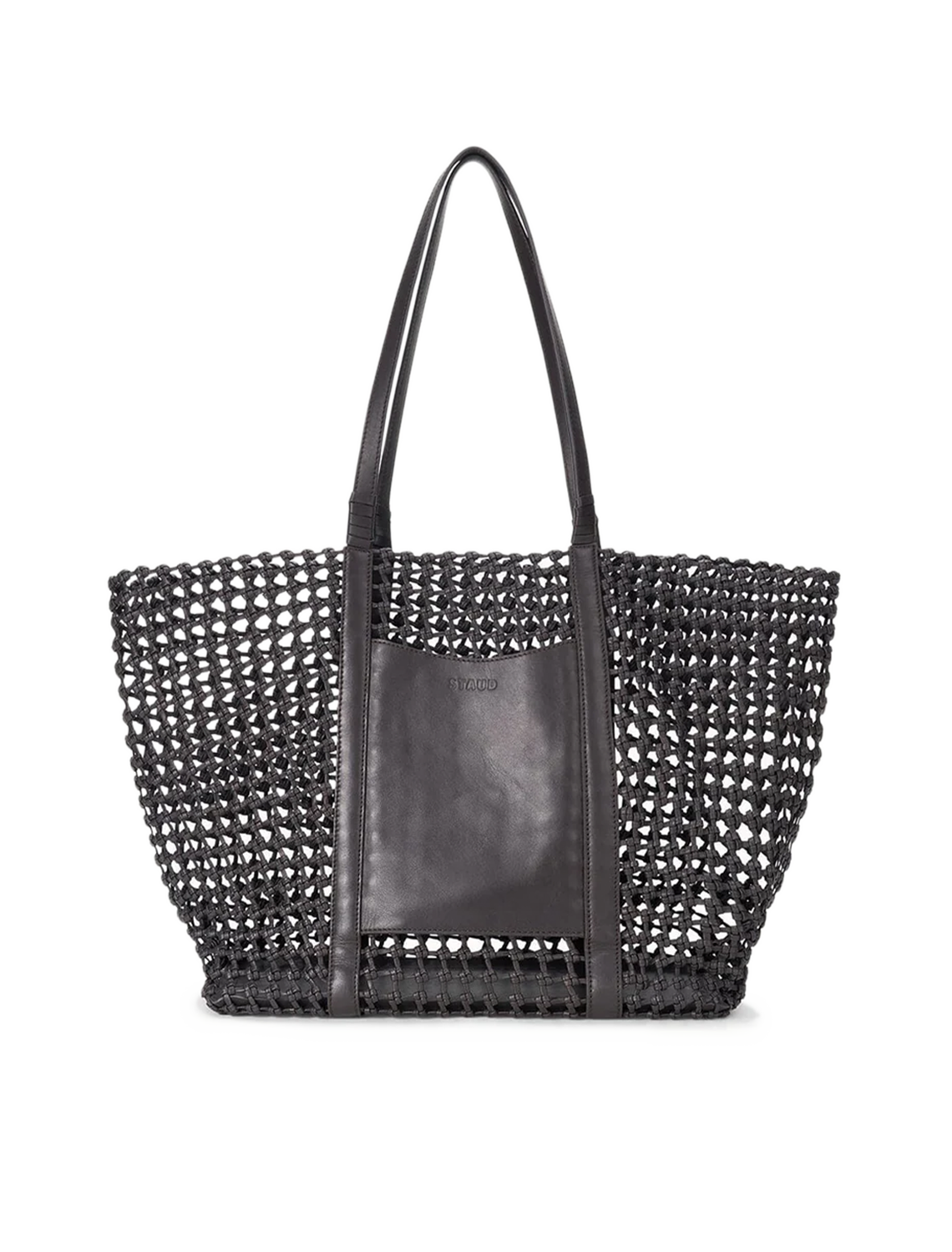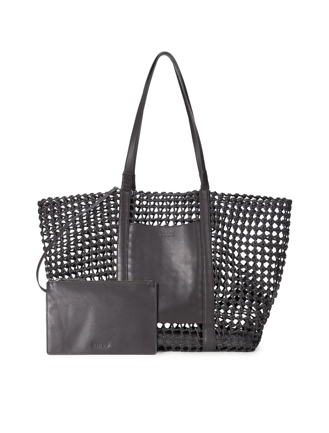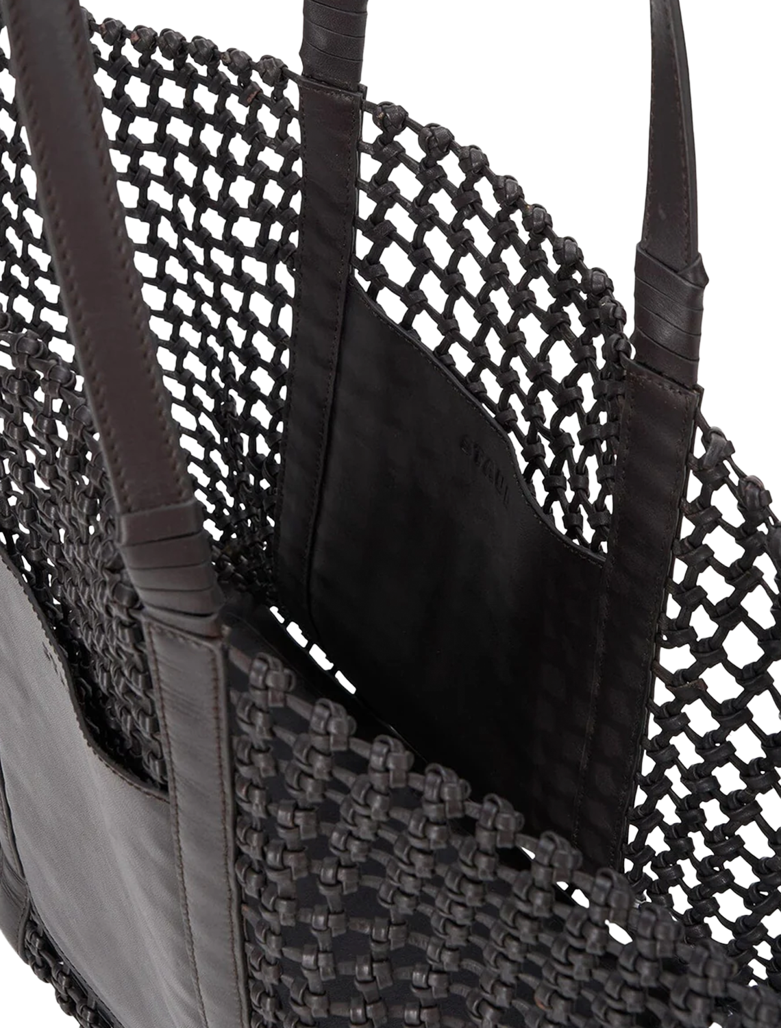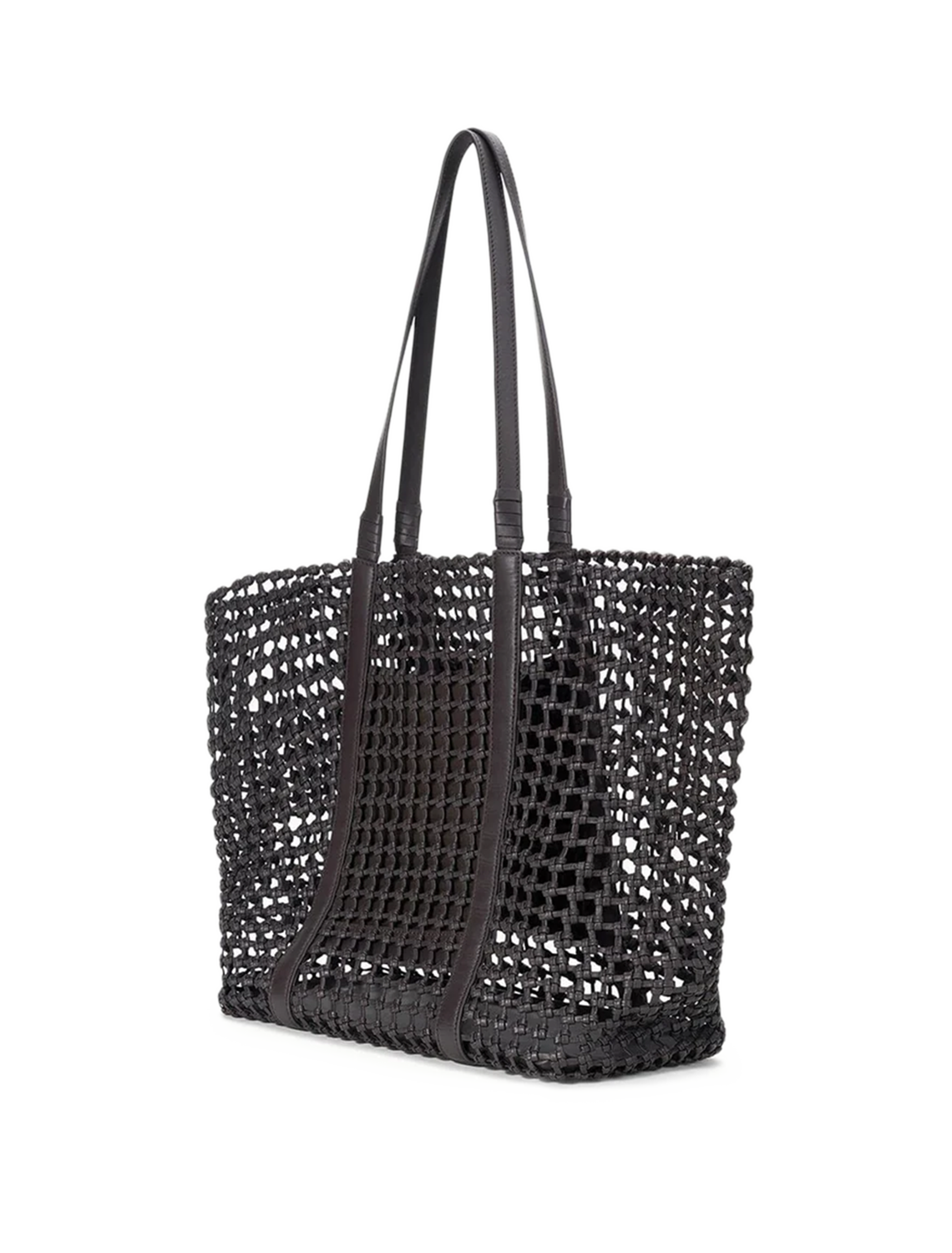 A hand-knotted open-weave leather construction defines this versatile tote, designed for everyday essentials and weekend getaways. Multiple interior and exterior pockets keep your belongings organized, while the included removable leather pouch offers flexibility for smaller items.