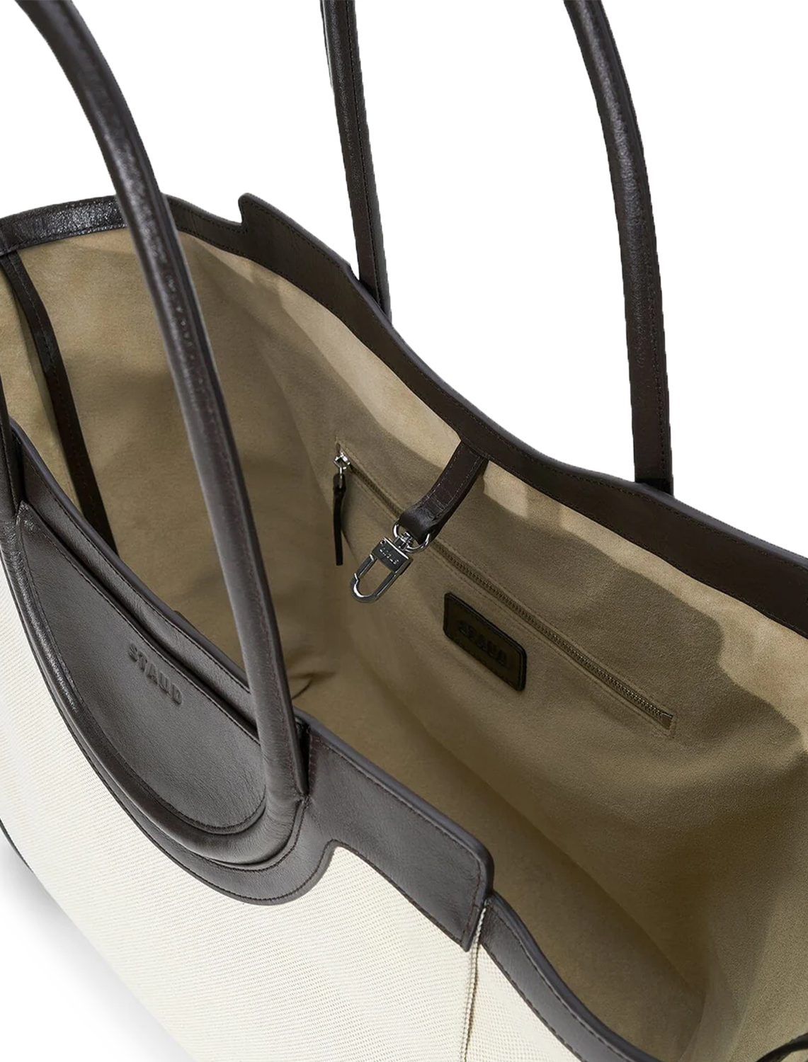 The Maude Tote is an open top tote bag with gusset closure ties and a center top dog-clip closure to keep your belongings secure. It features the Maude family's signature rounded straps and includes an interior zip pocket.