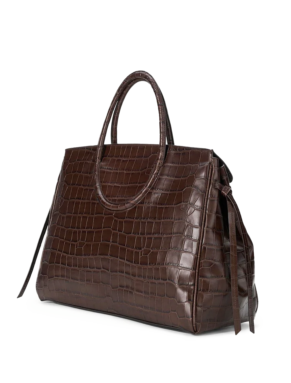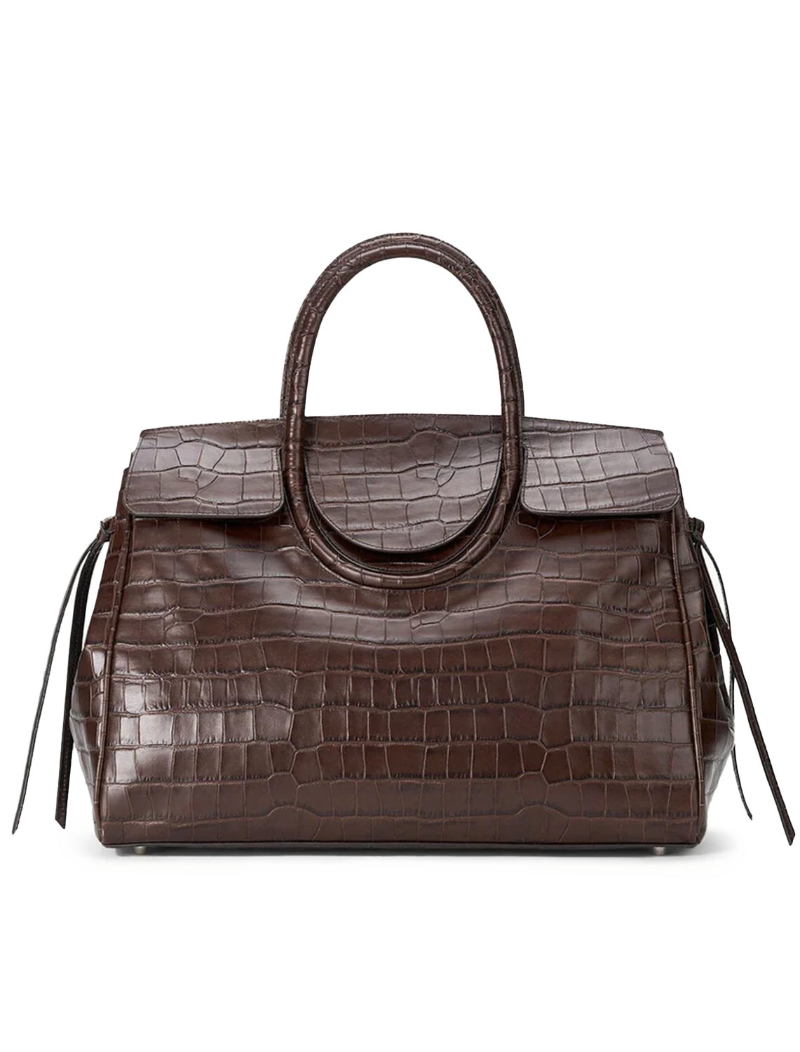 This style is an oversized carryall bag crafted in a soft embossed leather. This style has a front slip pocket for your phone, an easy flap closure, and interior zipper pocket and organizational pockets.