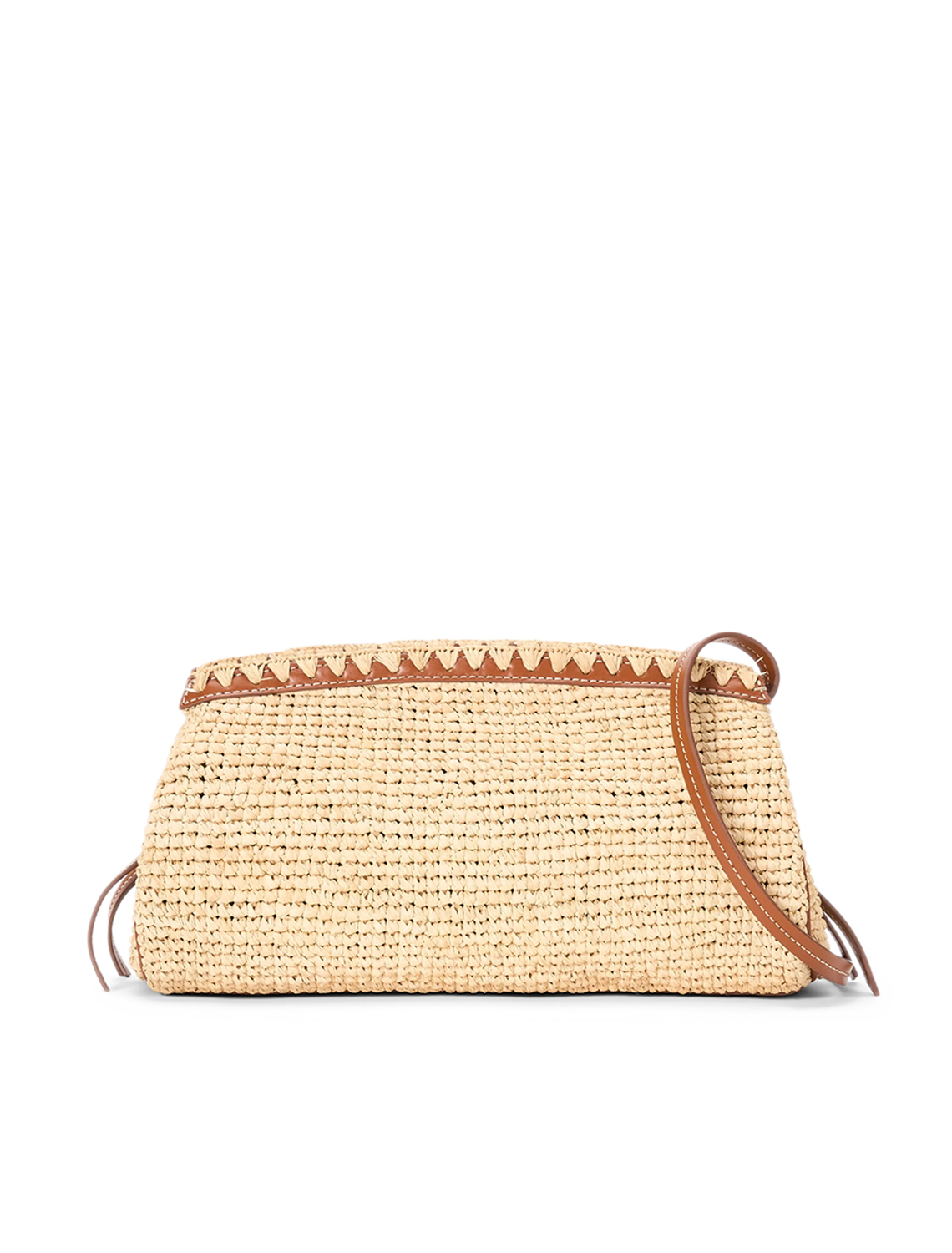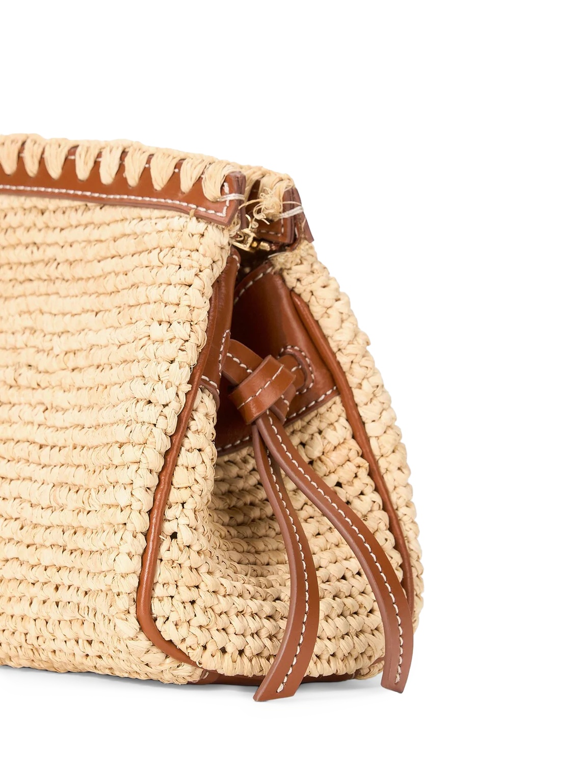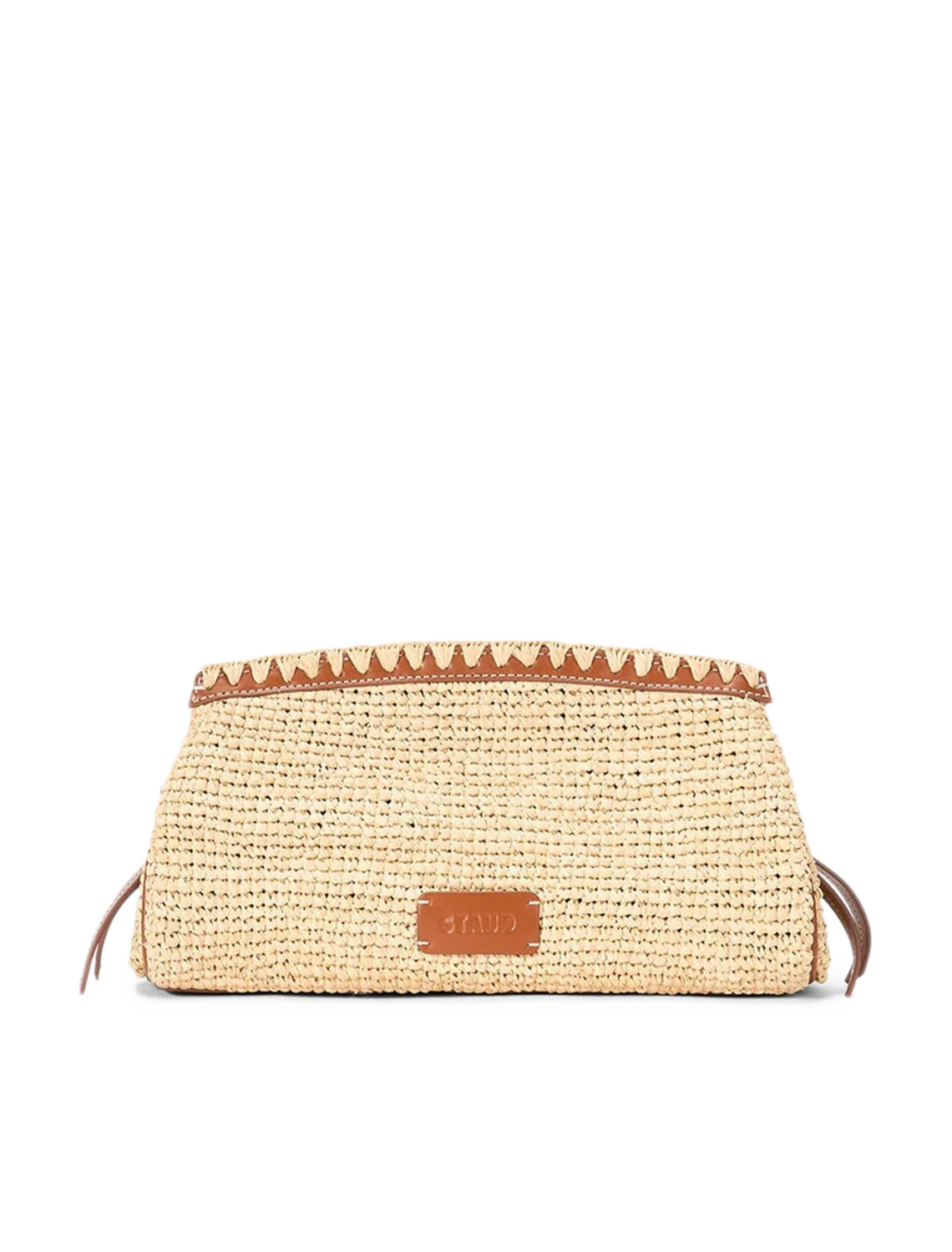 The Maude Convertible Clutch is a raffia hand-held clutch with Staud's signature Maude knotted tie detail at the sides. It features an interior zip pocket, magnetic closure and removable leather shoulder strap.