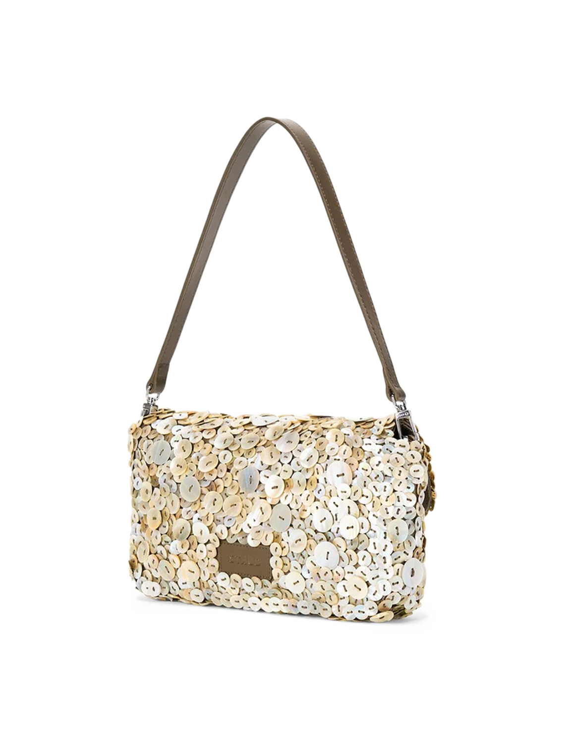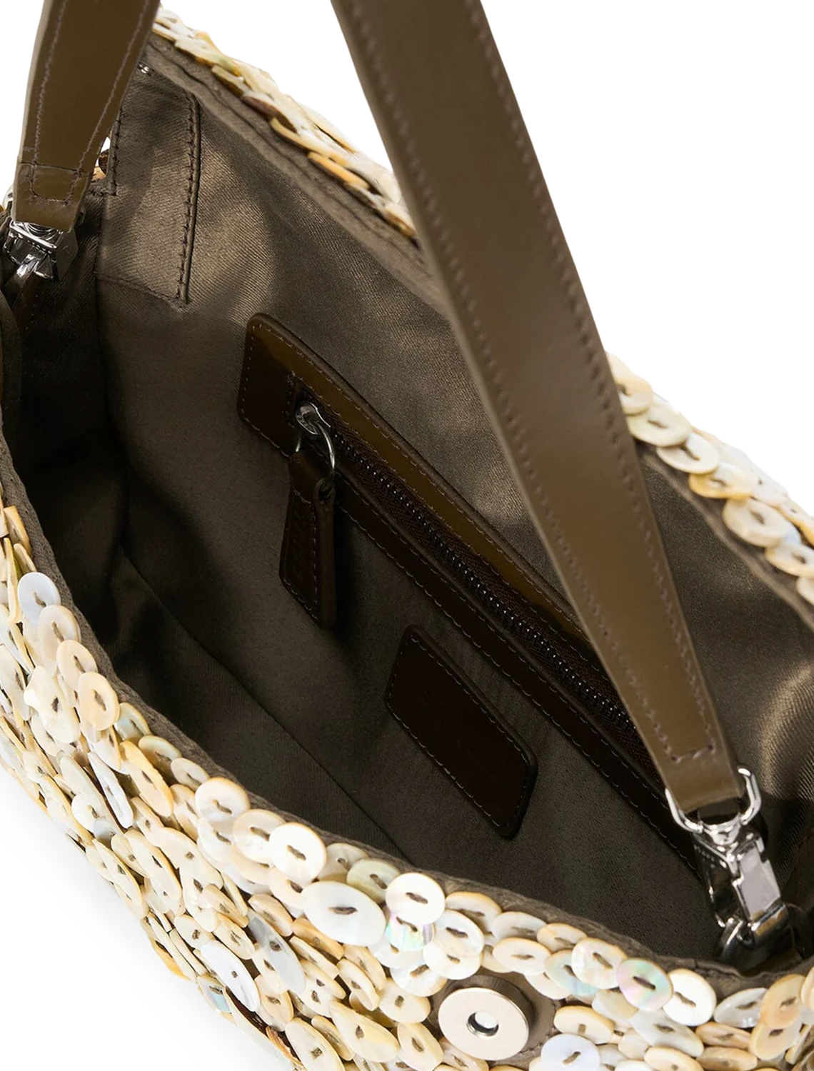 • self: 100% pearl oyster | base: 100% rayon | trim: 100% polyurethane (vegan leather)