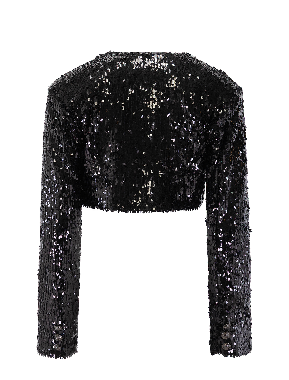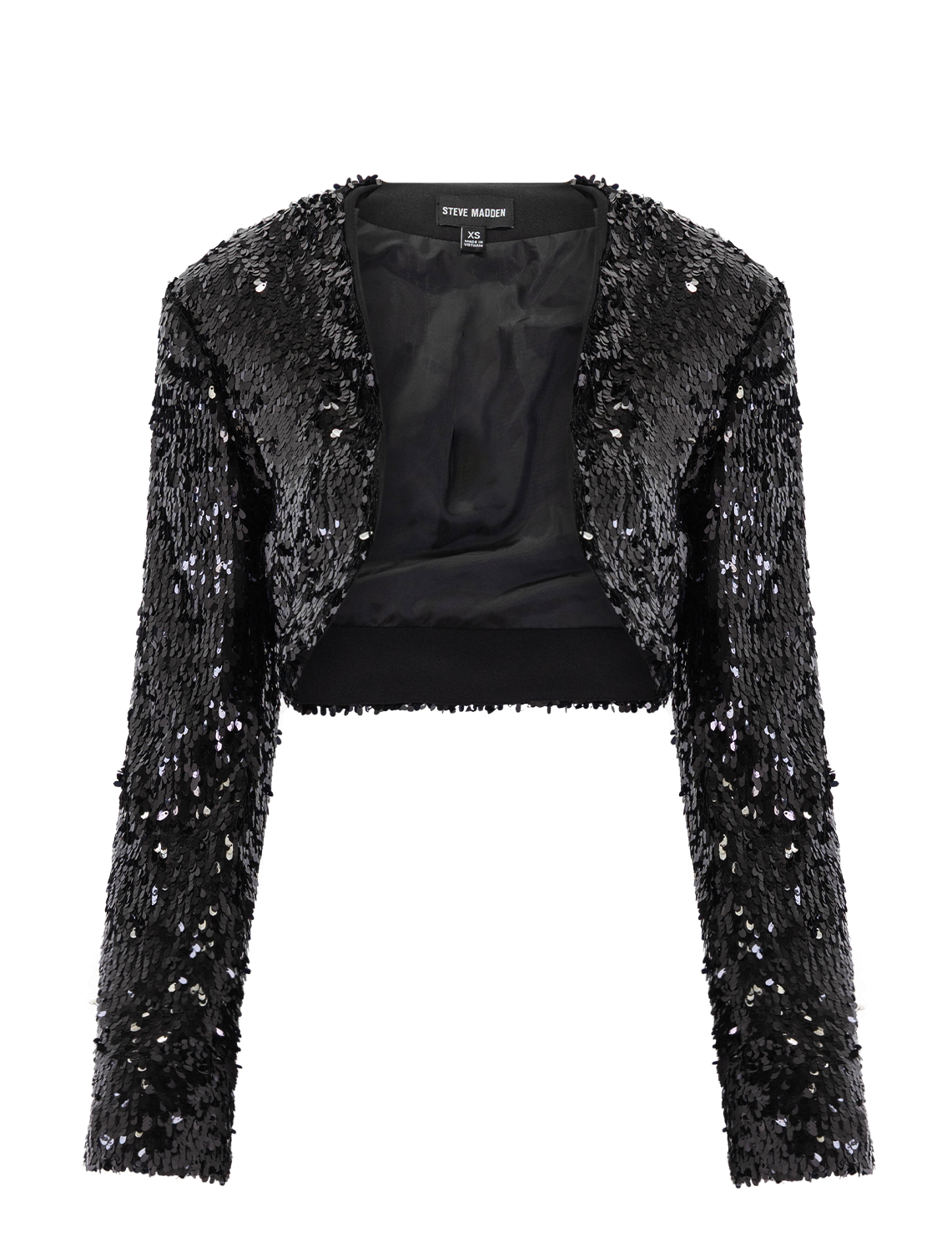 Bring some shimmery glam to your look with this open-front cropped jacket that's coated in light-catching sequins.