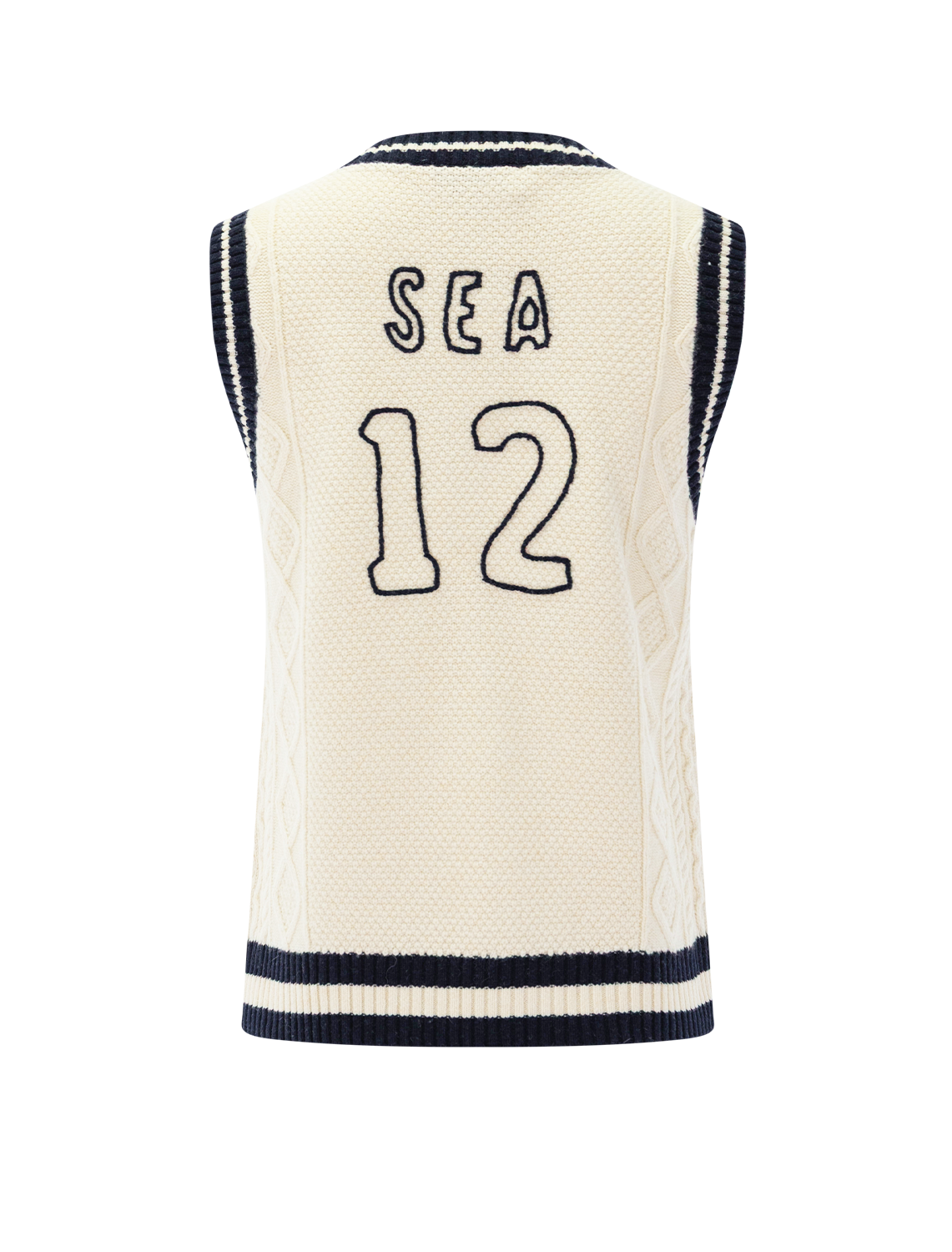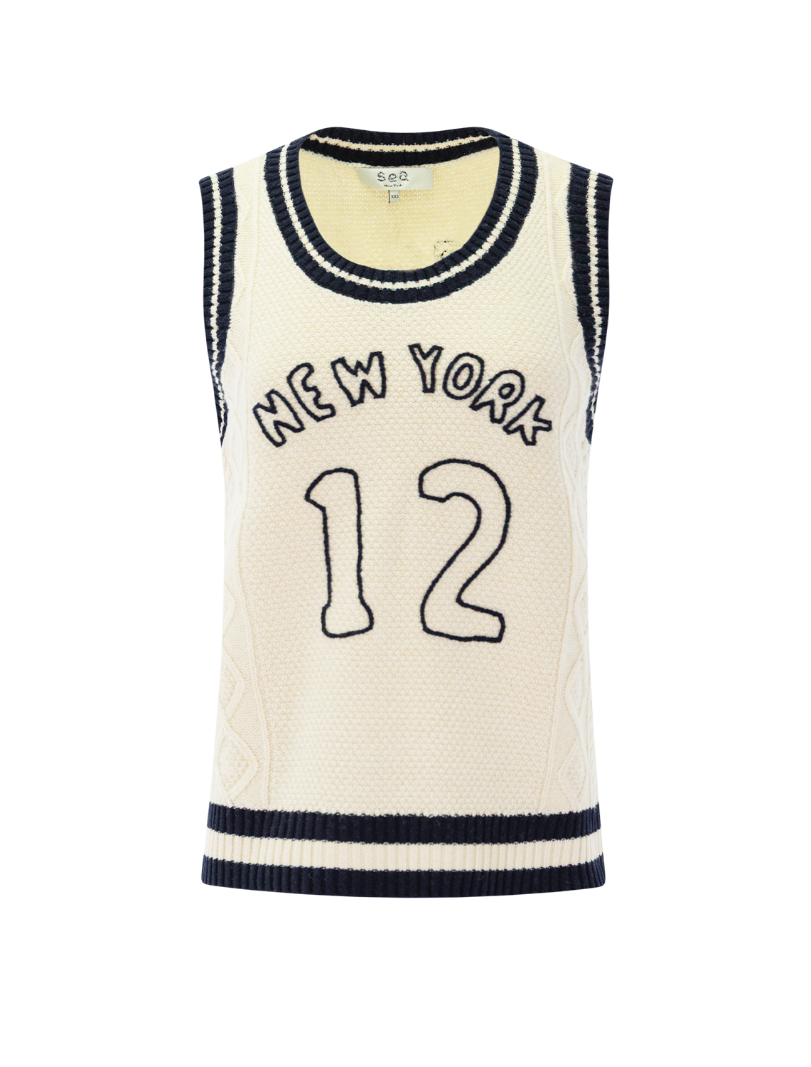 The Maren knit vest features classic cable-knit detailing and striped rib-knit trim. Embroidered sports jersey numbers on the front and back add a playful, athletic-inspired touch.