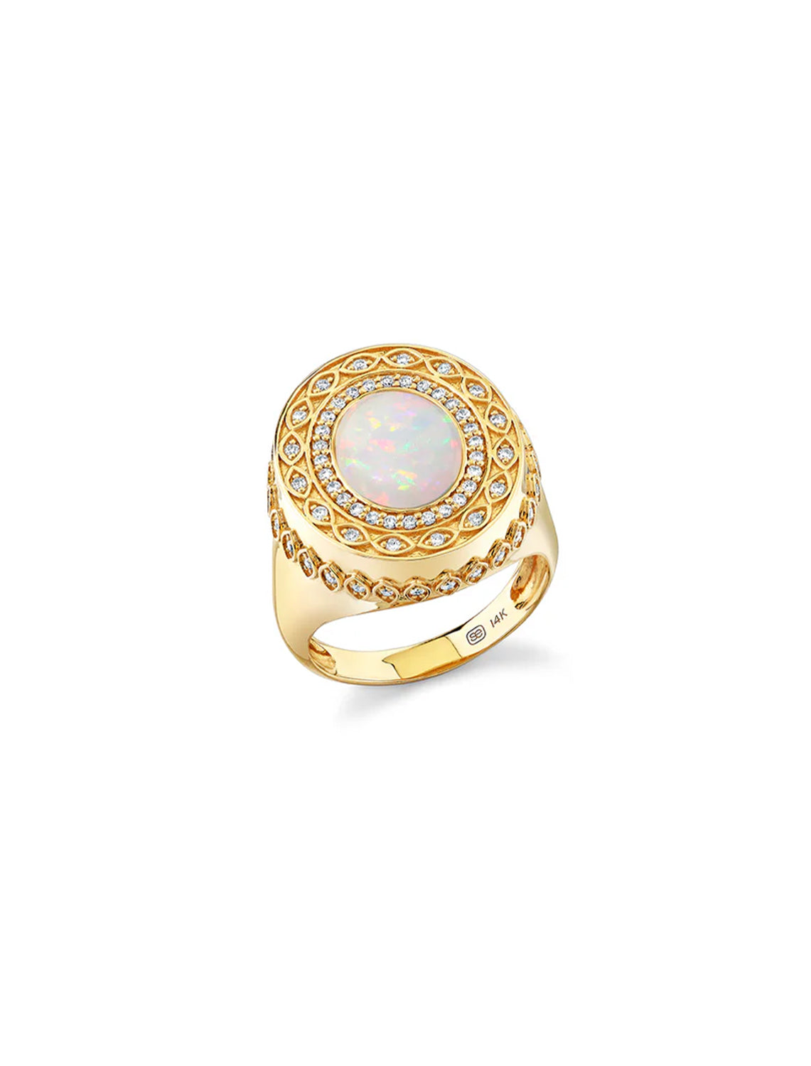 Elevate your style with this exquisite signet ring, crafted in luminous 14k yellow gold. The ring features a stunning marquise-shaped eye motif, adorned with brilliant pave diamonds that sparkle with every movement. At its heart lies a mesmerizing opal cabochon, radiating a spectrum of iridescent hues that capture light beautifully.