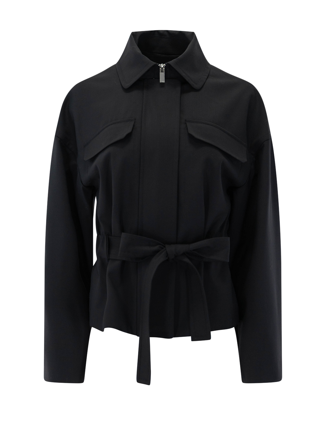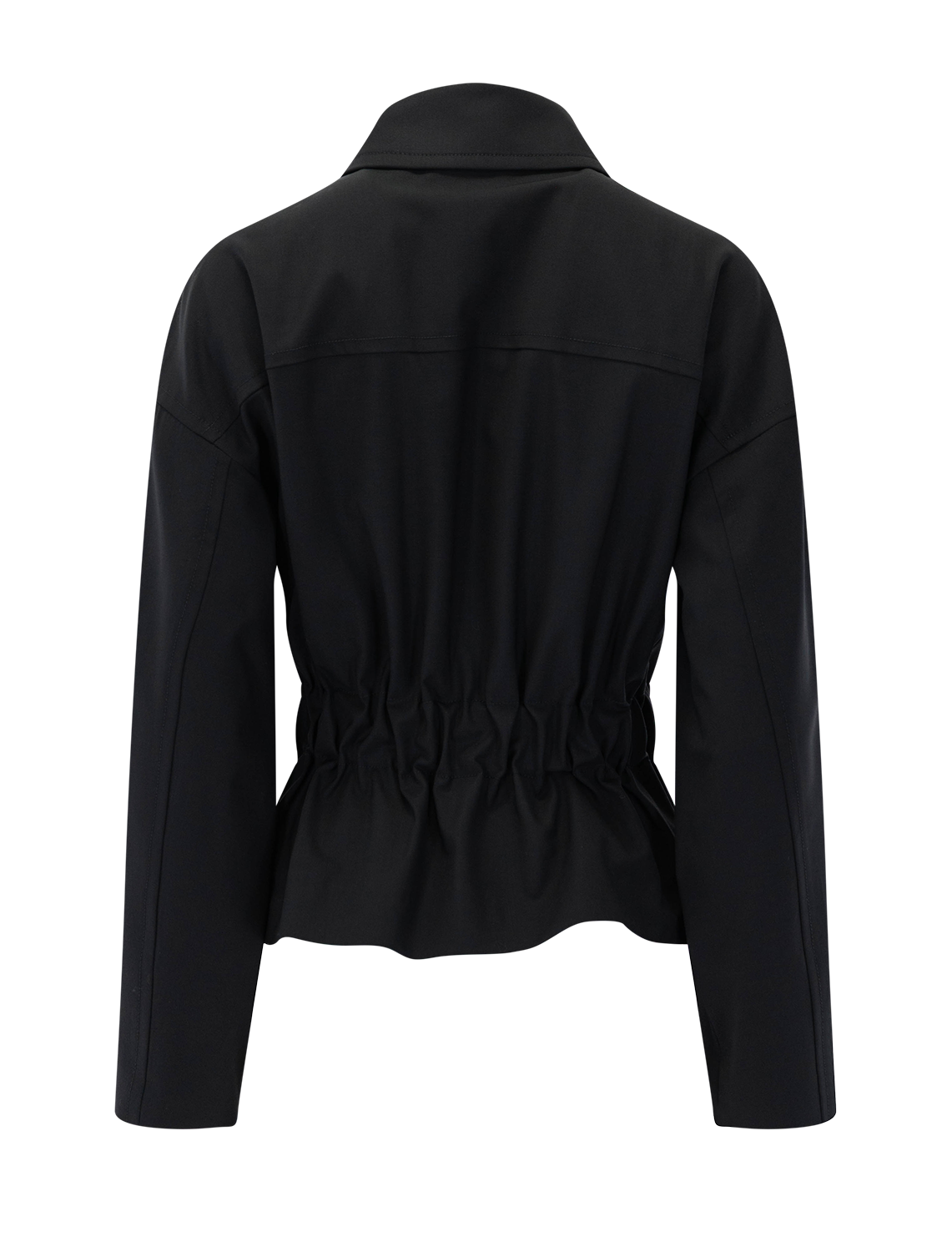 An attached tie waist and elastic back waistband shape this stretch-wool jacket balancing structure with a polished, sophisticated finish.