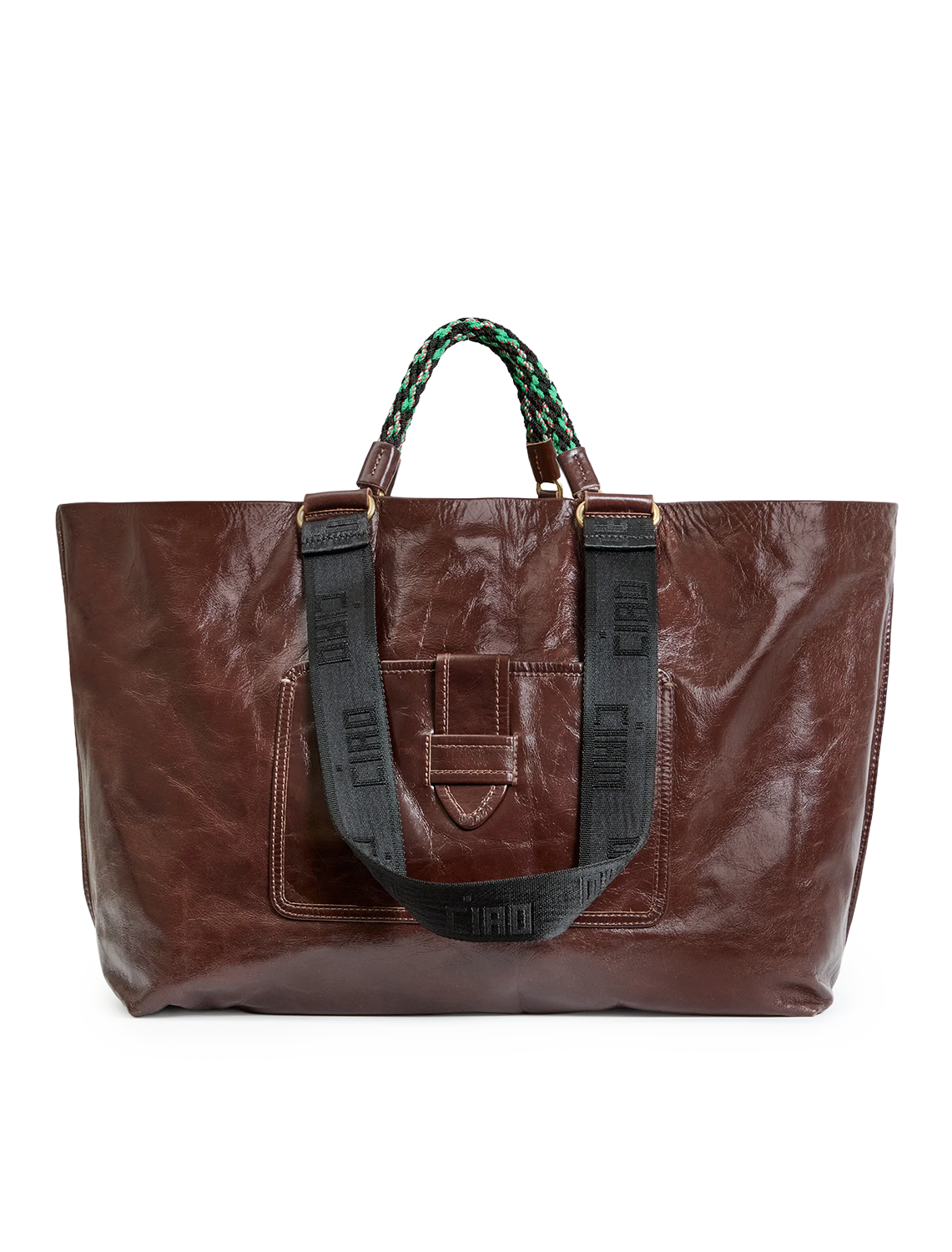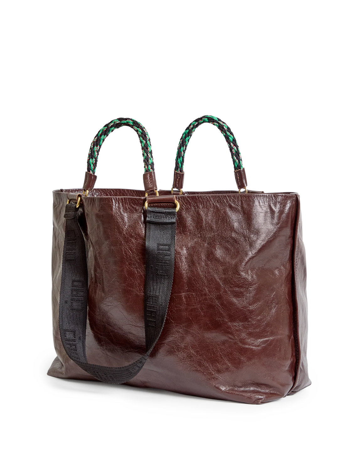 • thin, soft and durable Italian patent crinkle leather, nylon shoulder strap, rope handle
