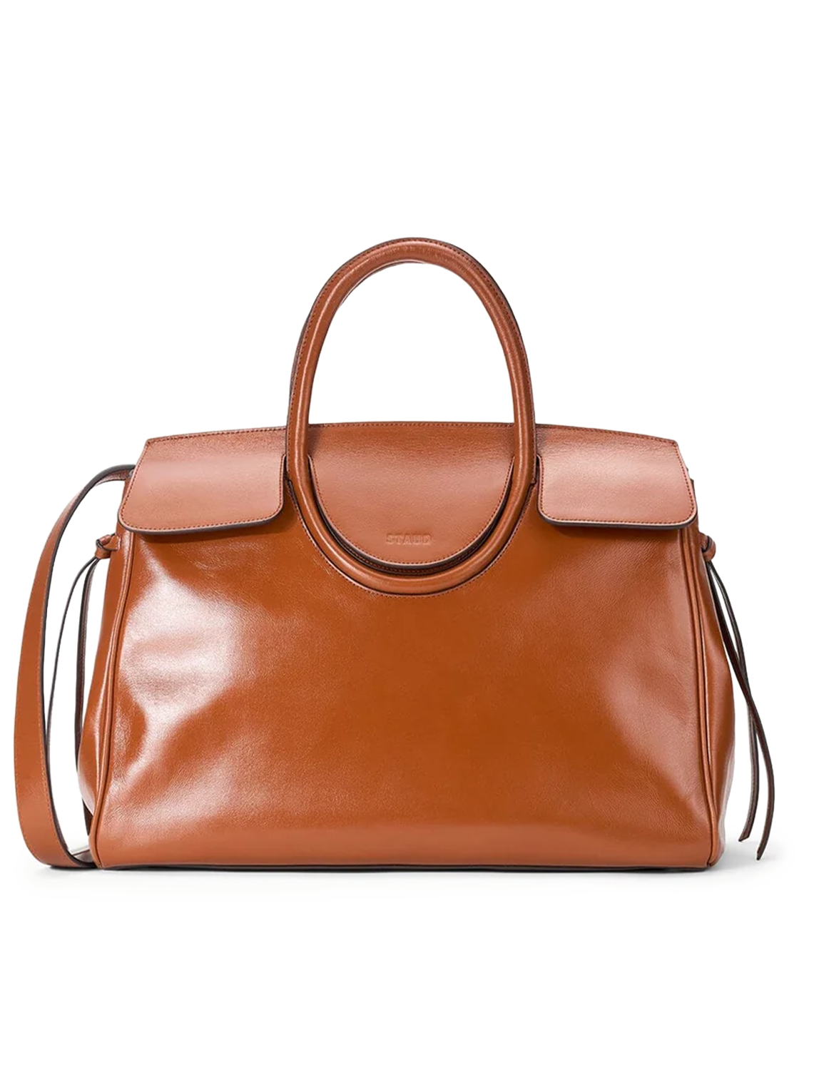 This style is an oversized carryall bag crafted in soft, polished leather. This style has a front slip pocket for your phone, an easy flap closure, and interior zipper pocket and organizational pockets.