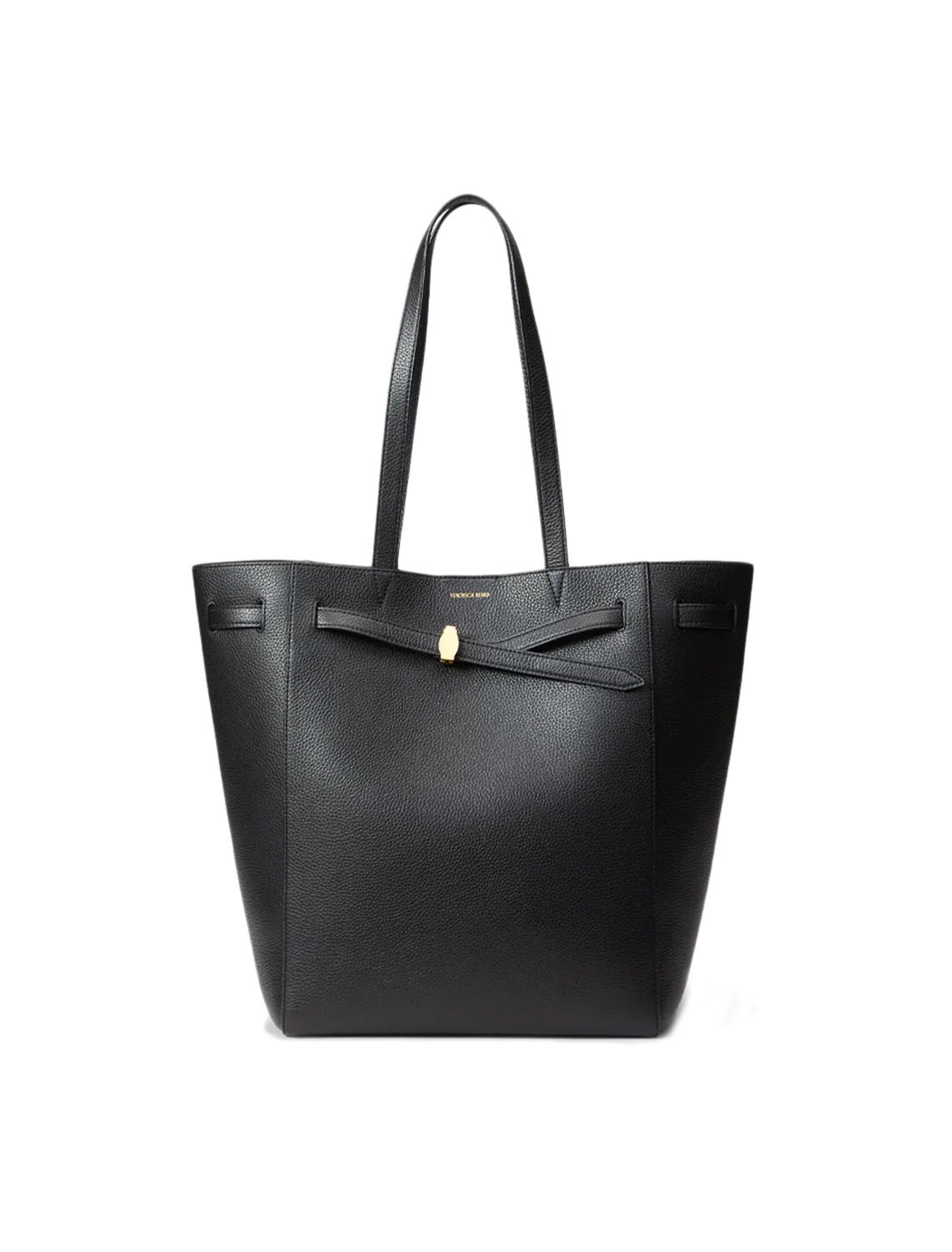 Made from smooth, supple black leather, it's an effortless go-anywhere everyday bag that takes you from work to weekends. Spacious enough for all your essentials, and then some, it features an adjustable belted strap with gold hardware and interior zip and slips pockets to keep smaller items organized and secure.