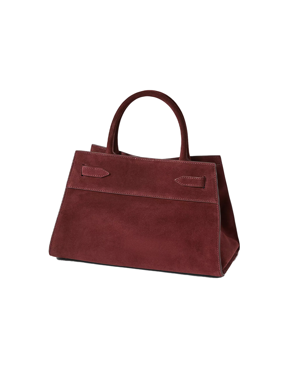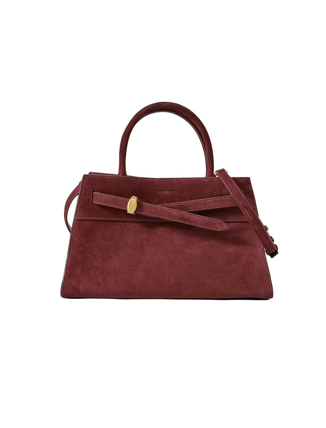 The aptly named Dash is a go-anywhere bag that takes you from work to weekends. Crafted from soft Italian suede in raisin with an adjustable belted strap, it’s designed with both a structured top handle and a removable shoulder strap for maximum versatility.