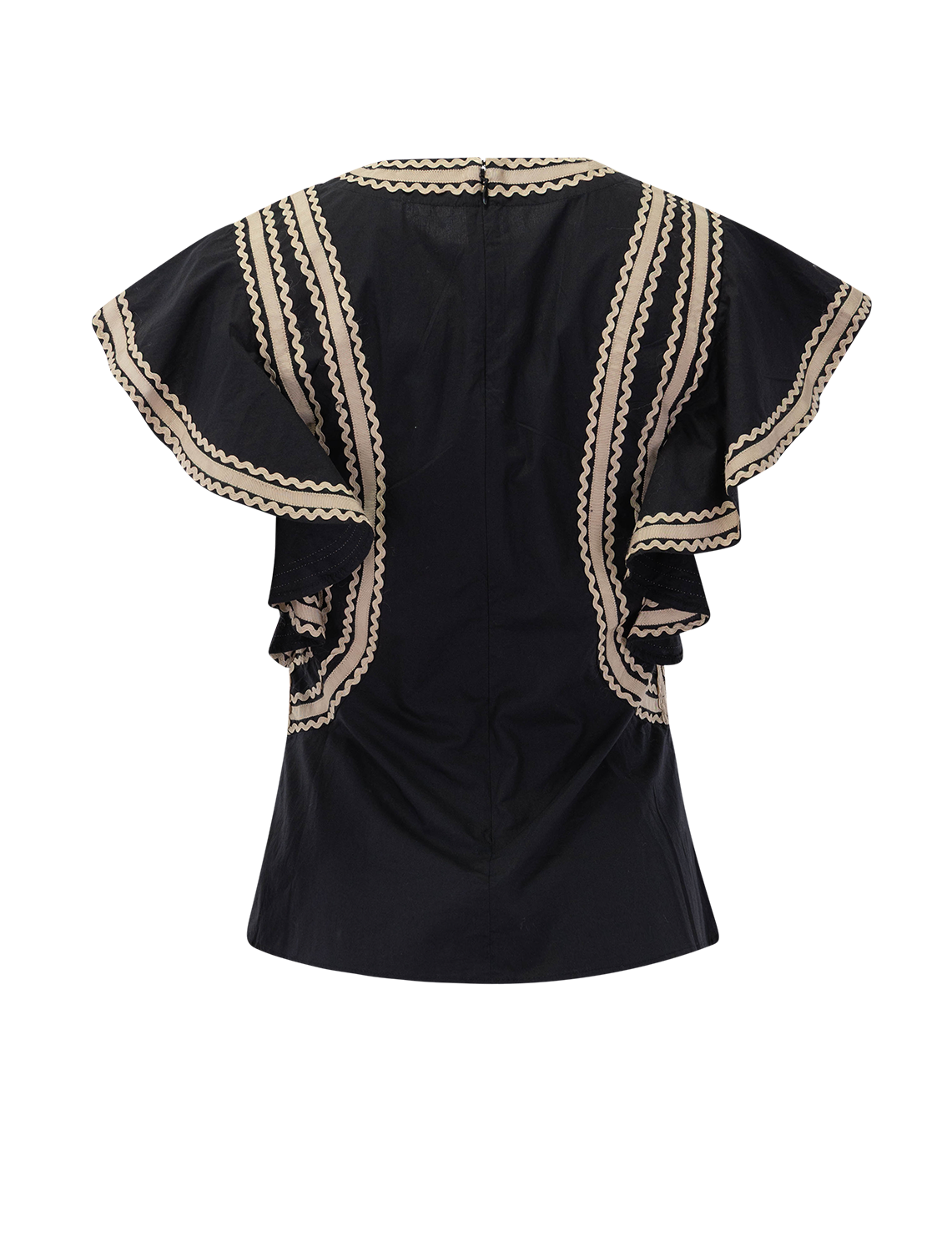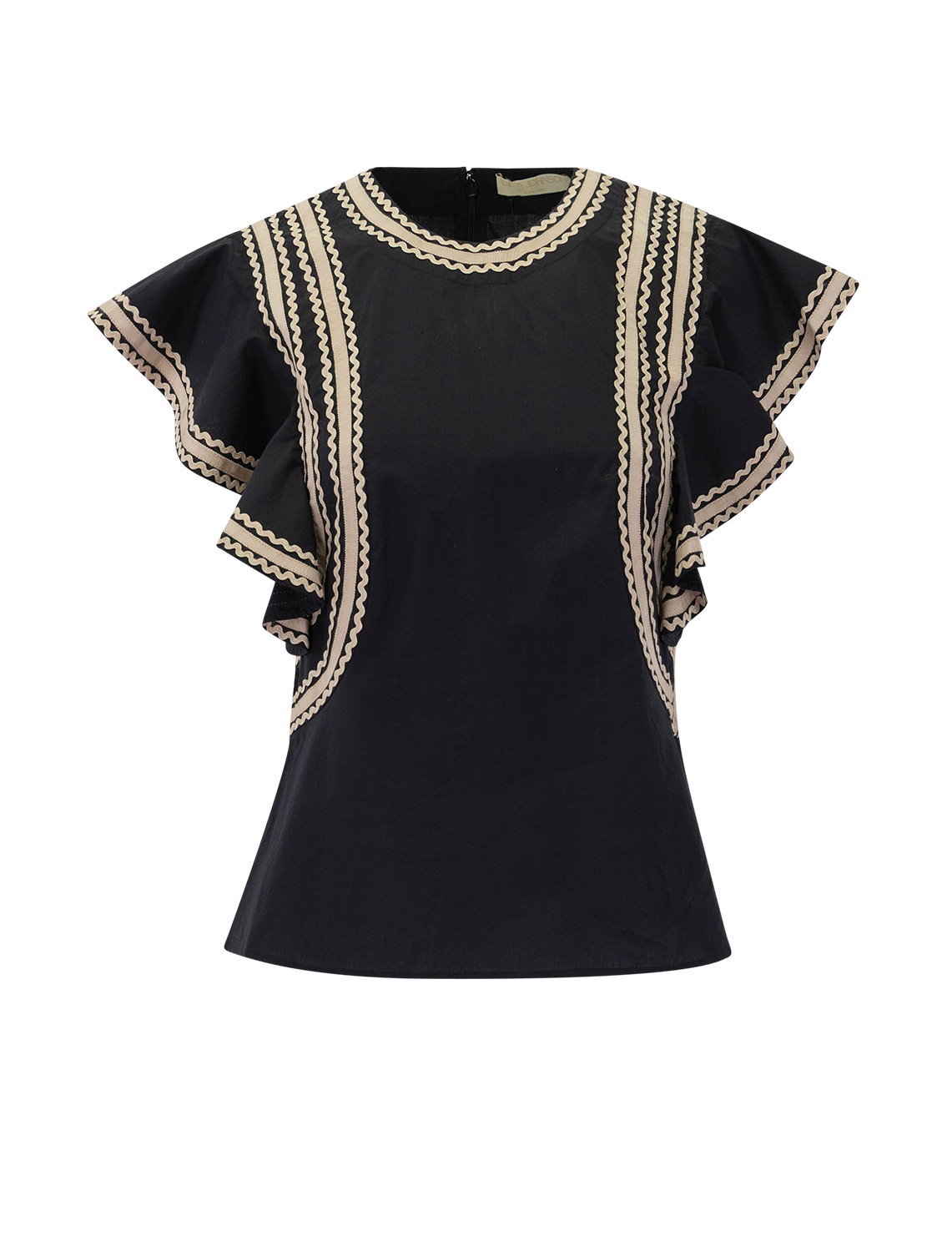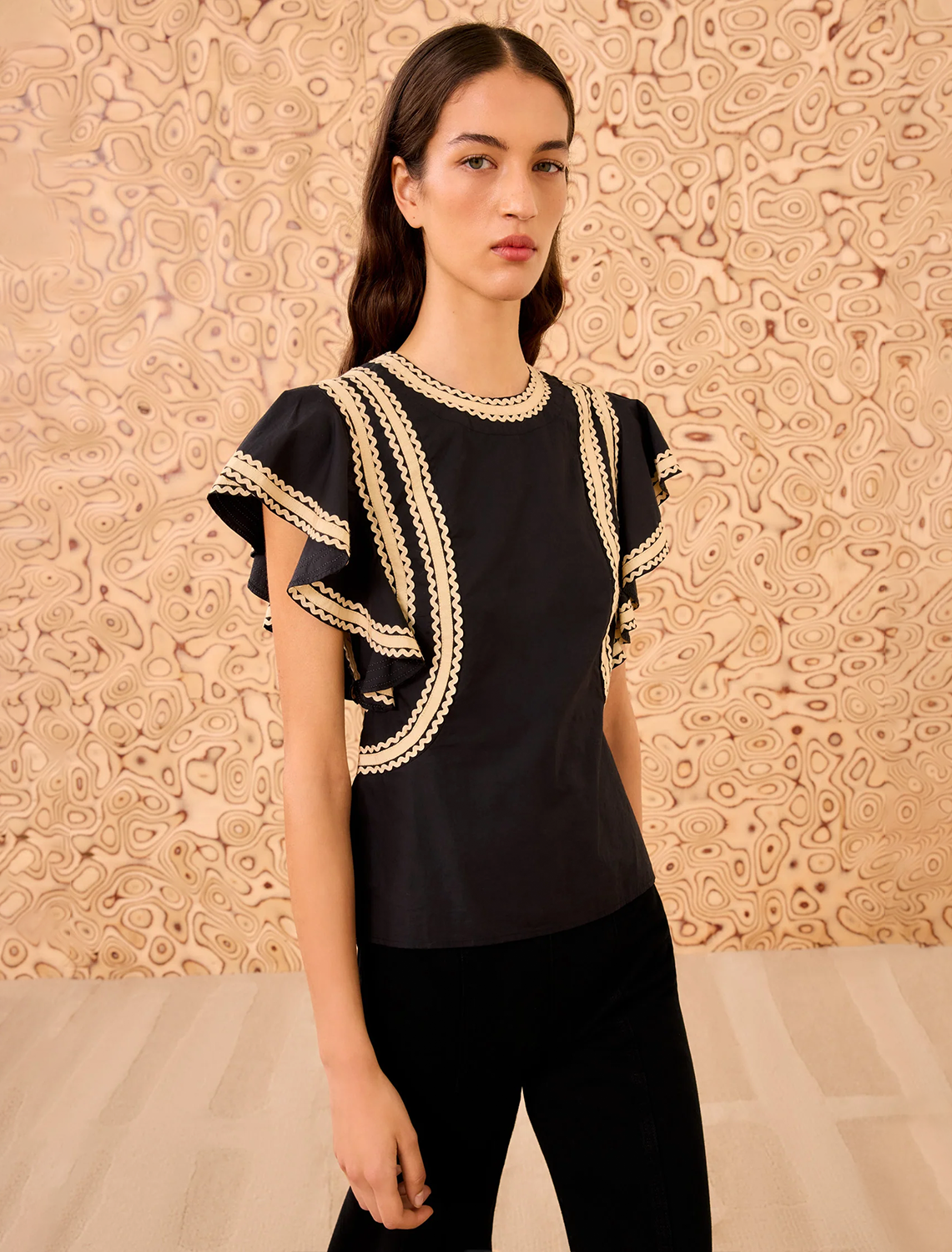 The Anora Top is adorned with ric-rac and grosgrain ribbons that bring graphic elegance to soft, water-washed poplin. This black top is framed by flutter sleeves and has an effortless fit ideal for styling with denim and tailoring.