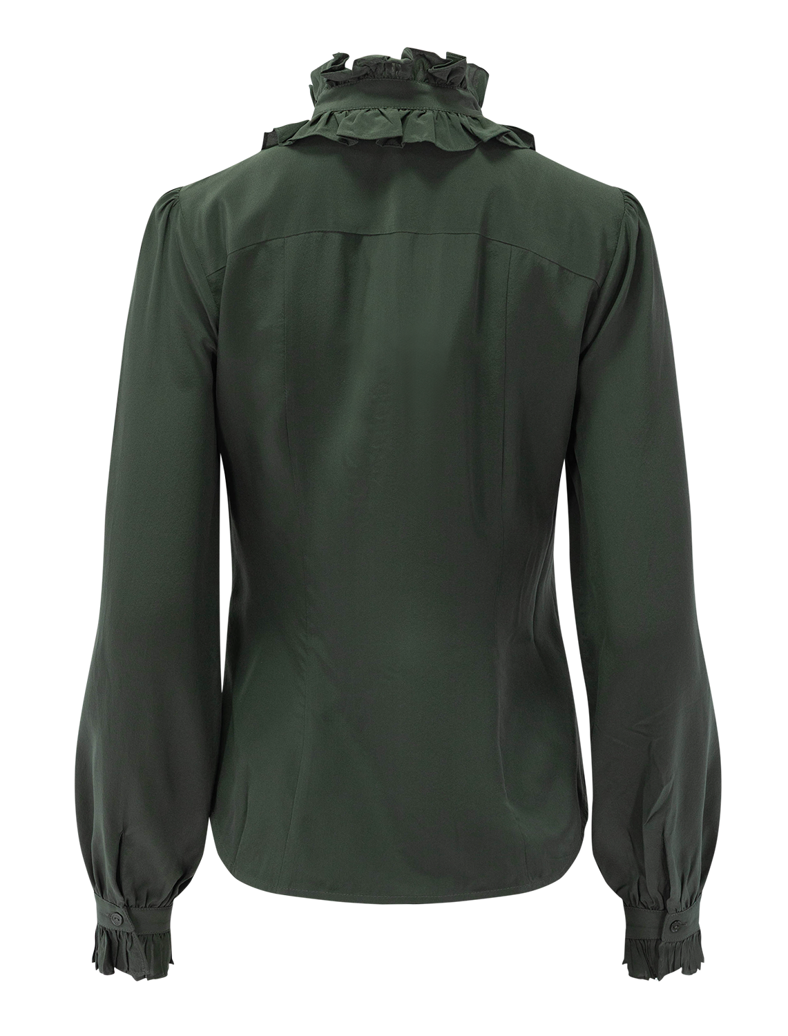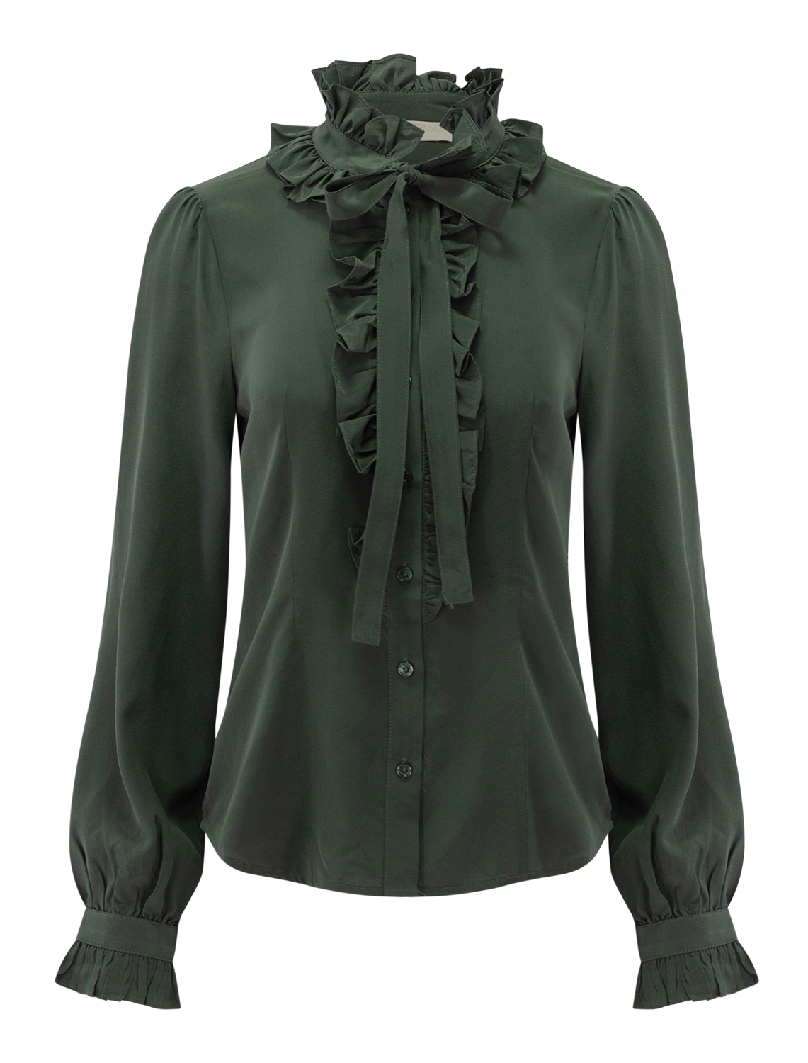 The Catroux Blouse is tailored from signature silk crepe de chine in a beautiful cypress for an elegant wardrobe mainstay. This fluid blouse is imbued with poetic detailing, with frills at the collar and fluted cuffs.