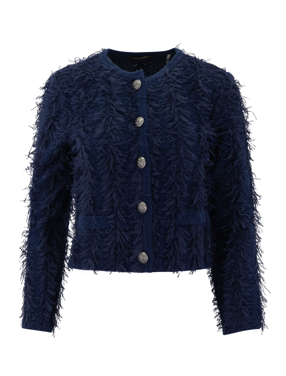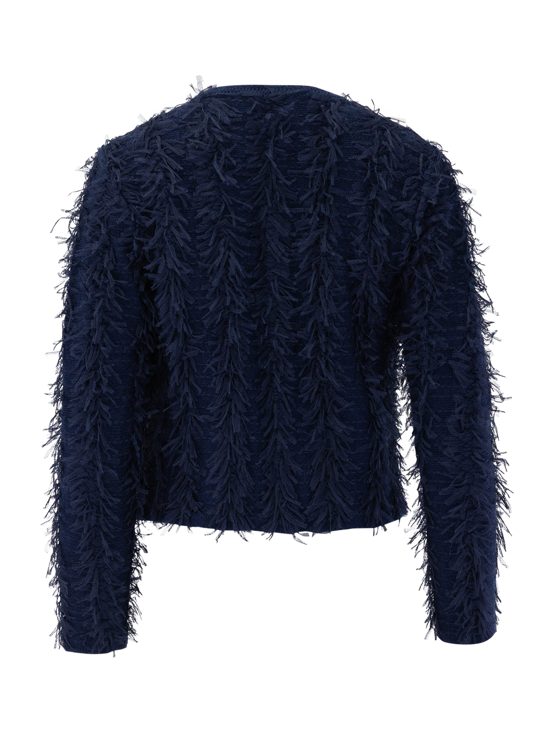 Gauzy fringe adds texture and movement to this polished cardigan knit in a woolly cashmere-kissed blend.