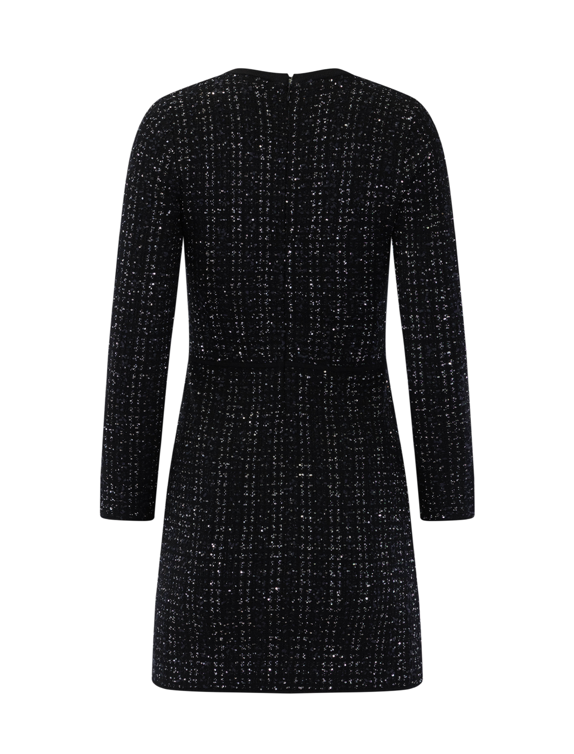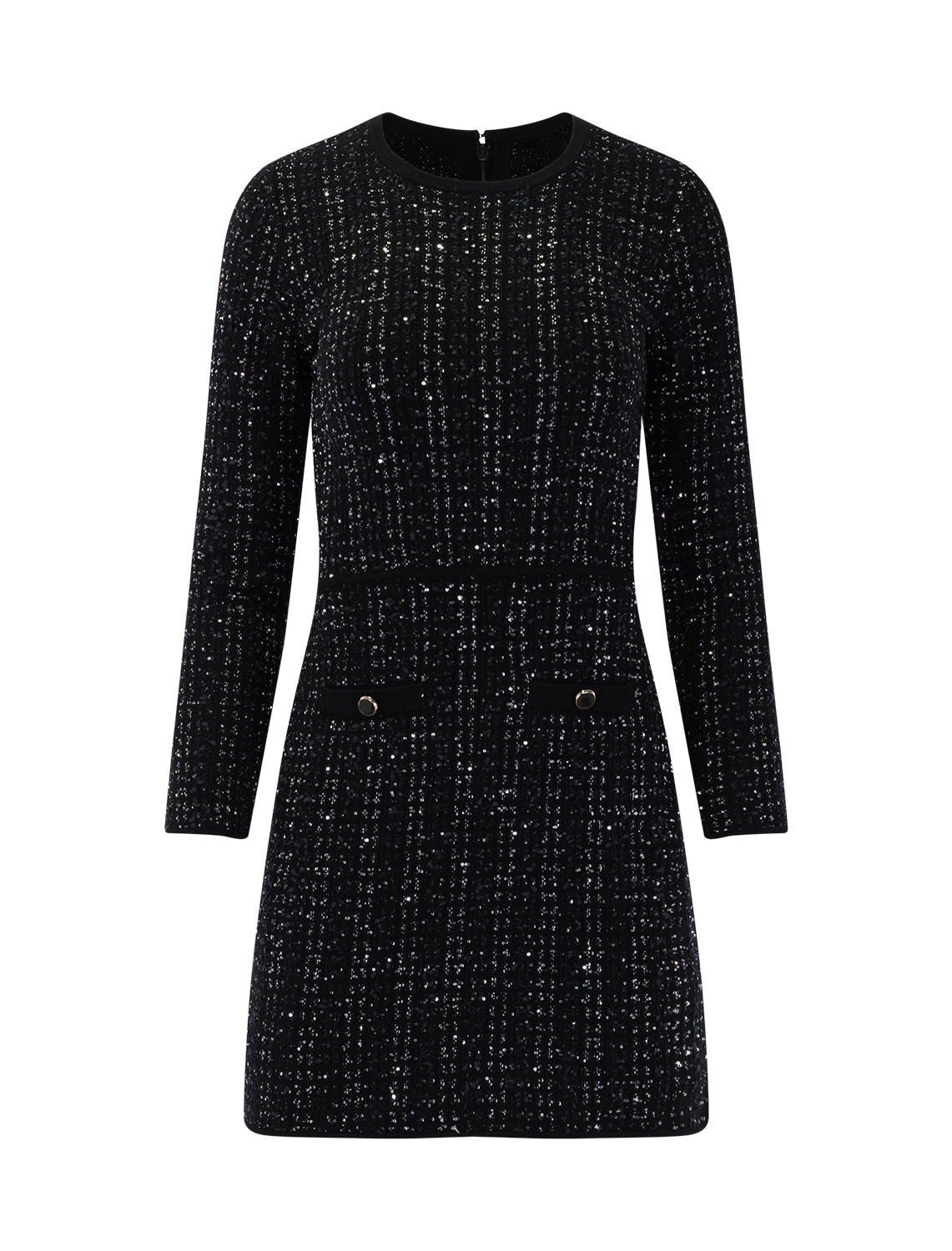 An opulent take on the jewel-neck Channing dress. Crafted in a black tweed-like knit with subtle stretch, it's embellished with sequins for subtle shine. Its clean, streamlined silhouette is finished with long sleeves and front hip pockets. A versatile go-to, it’s equal parts refined and elegant. Pair it with slingbacks or a tall, heeled boot for a night out.