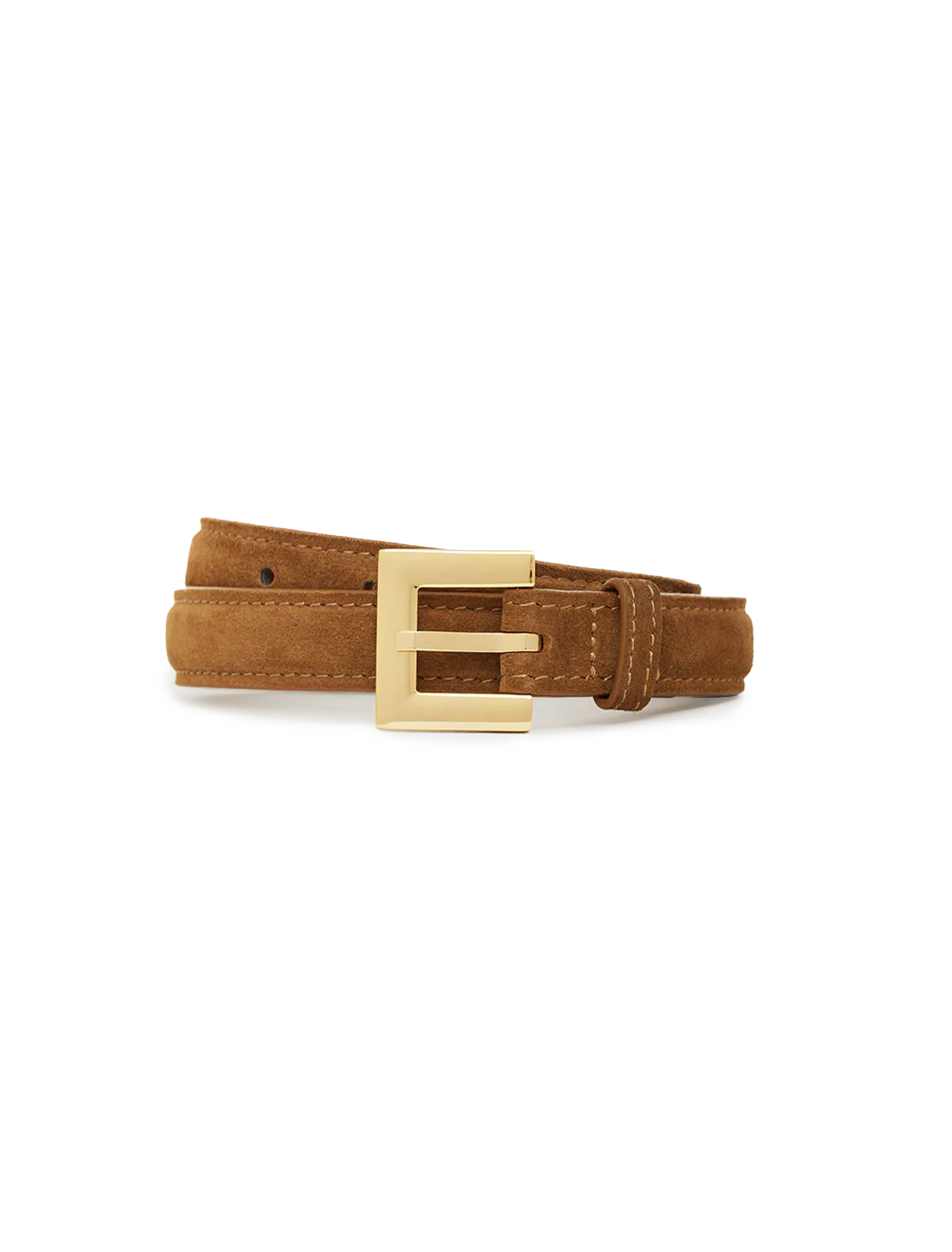 The Nicola Belt is crafted from a tobacco 100% cow leather with a slight sheen. This everyday style is slightly padded and features a custom square-shaped buckle in 14k gold-plated zinc engraved with subtle ANINE BING branding.