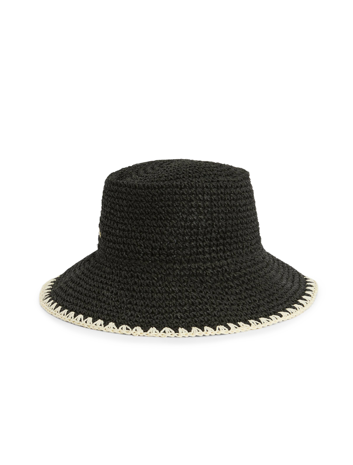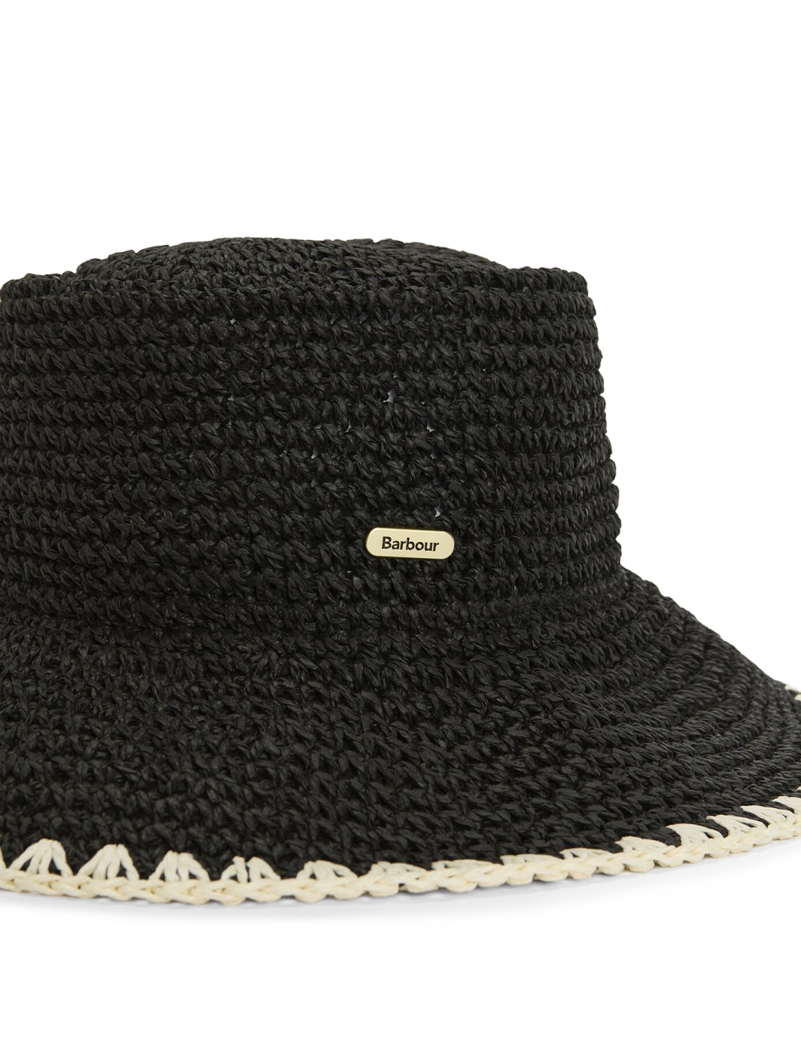 The Barbour Camille Crochet Hat is a summer-ready bucket hat crafted with a textured crochet-effect weave and contrast whip stitching on the brim. Finished with internal Barbour logo tape and a branded metal plate on the wearer’s left side, it combines heritage detailing with lightweight, stylish sun protection for warm-weather wear.