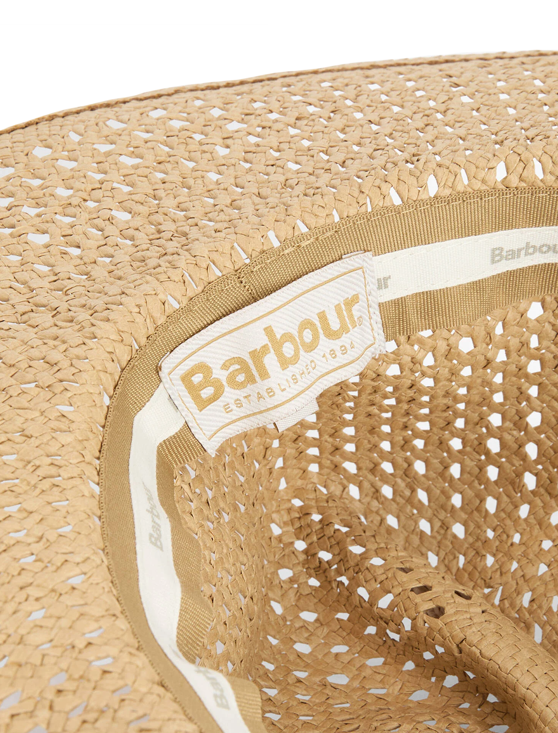 The Barbour Gabby Fedora Hat is crafted with an open-weave design for lightweight, breathable summer wear. Featuring a faux suede chin strap with a Barbour-branded round toggle, internal logo tape, and a fixed metal Barbour plate on the wearer’s left side, it combines heritage-inspired detailing with stylish sun-ready functionality.
