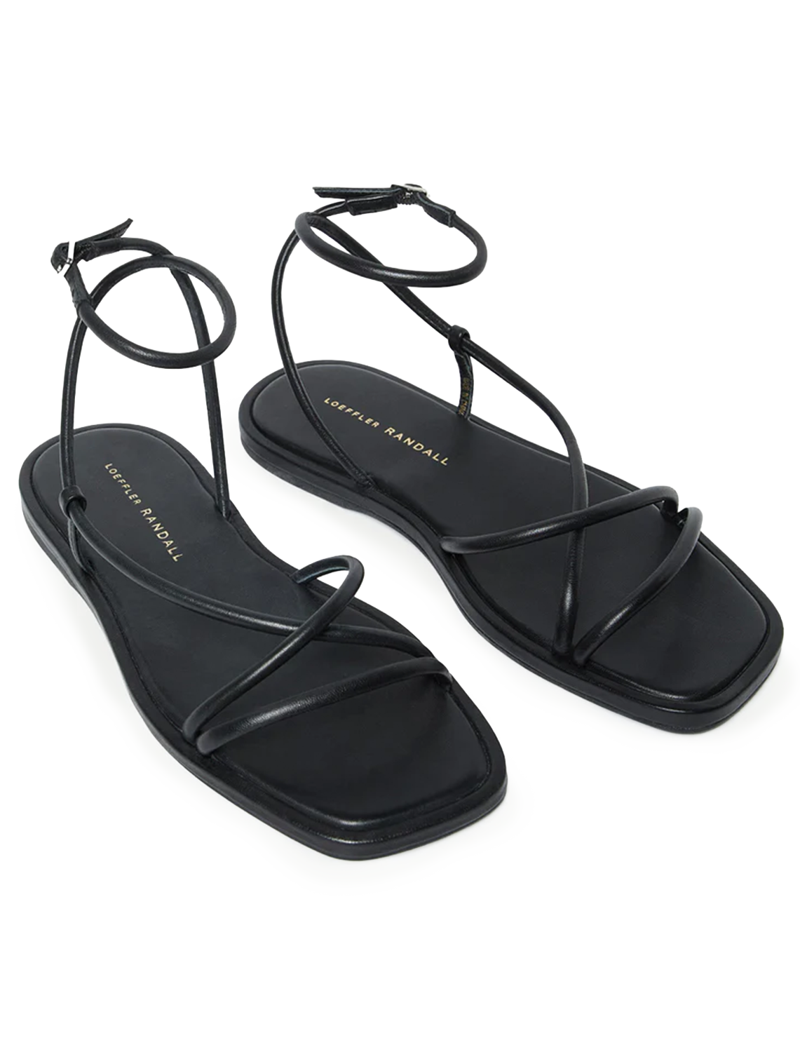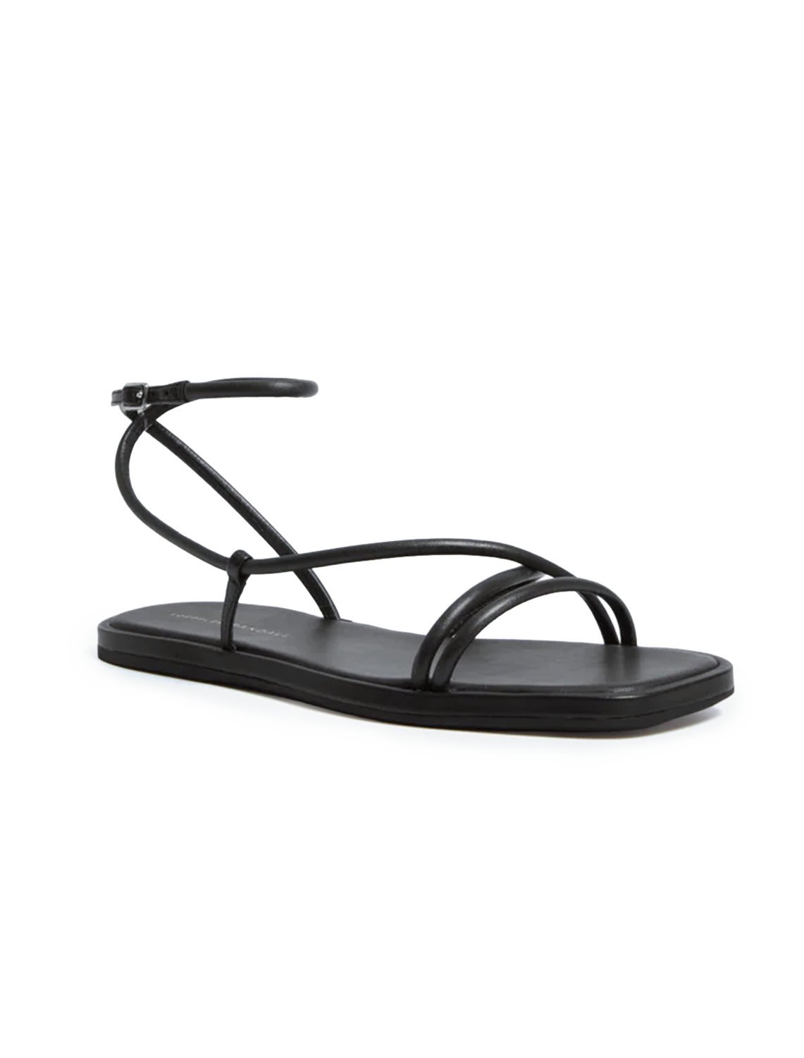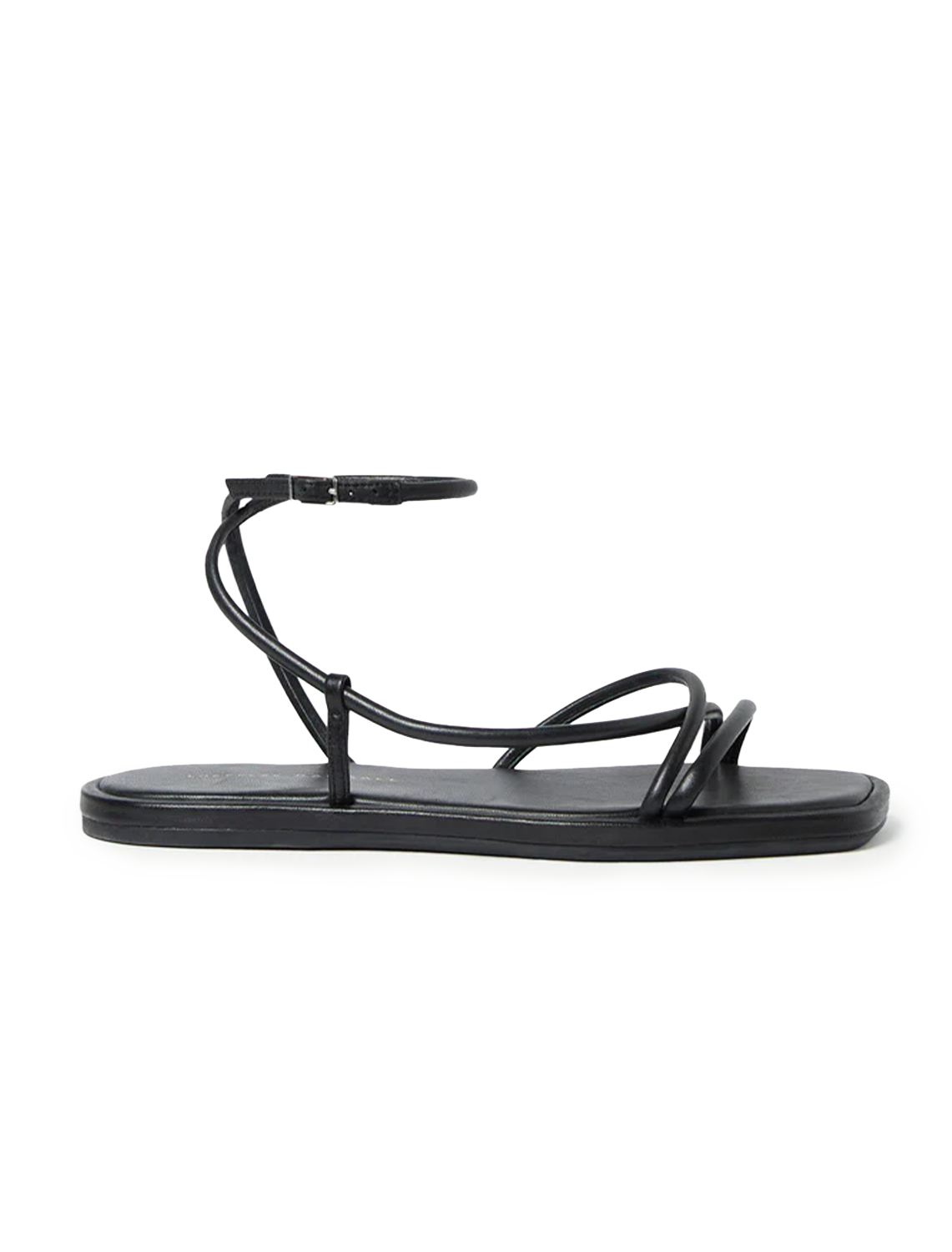 Flat sandal in timber brown nappa leather with a minimal strappy design. Features an open toe, and an adjustable, wrapped ankle strap with buckle closure.