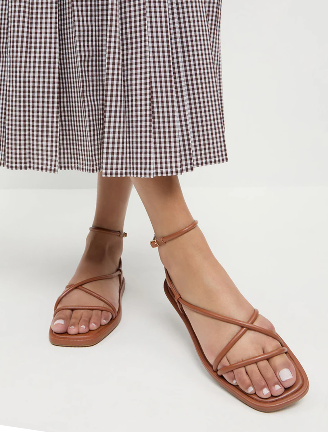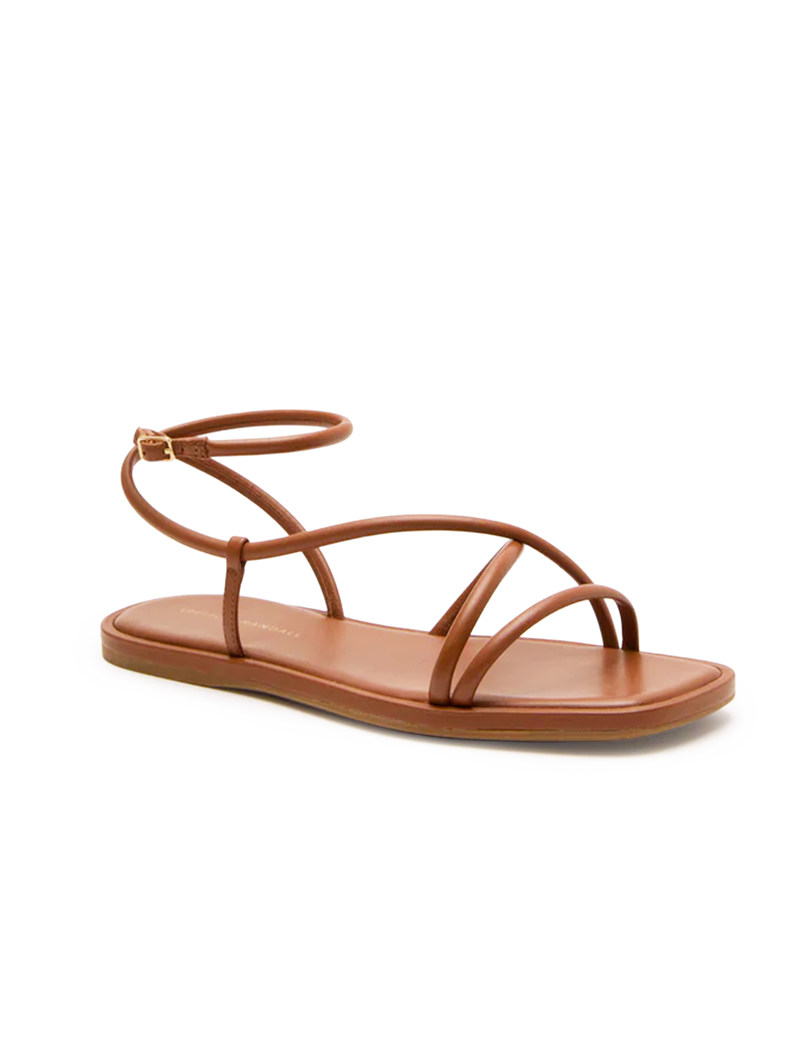 Flat sandal in timber brown nappa leather with a minimal strappy design. Features an open toe, and an adjustable, wrapped ankle strap with buckle closure.