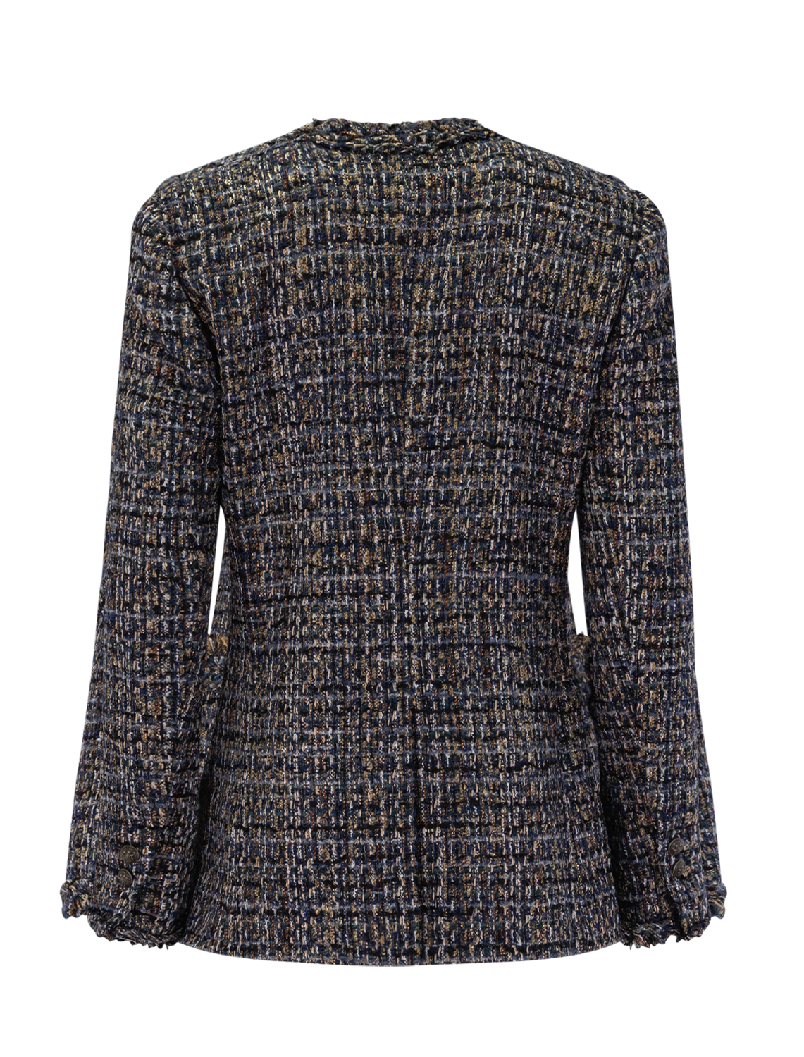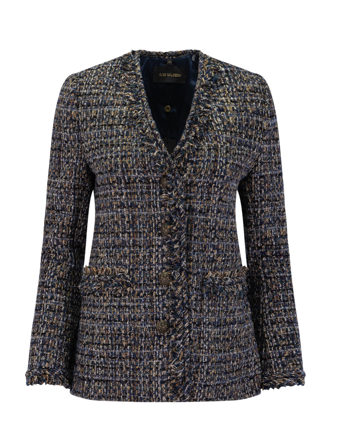 Feathery frayed trim adds texture and dimension to this woolly tweed jacket made in a longline silhouette and accented with embossed buttons.