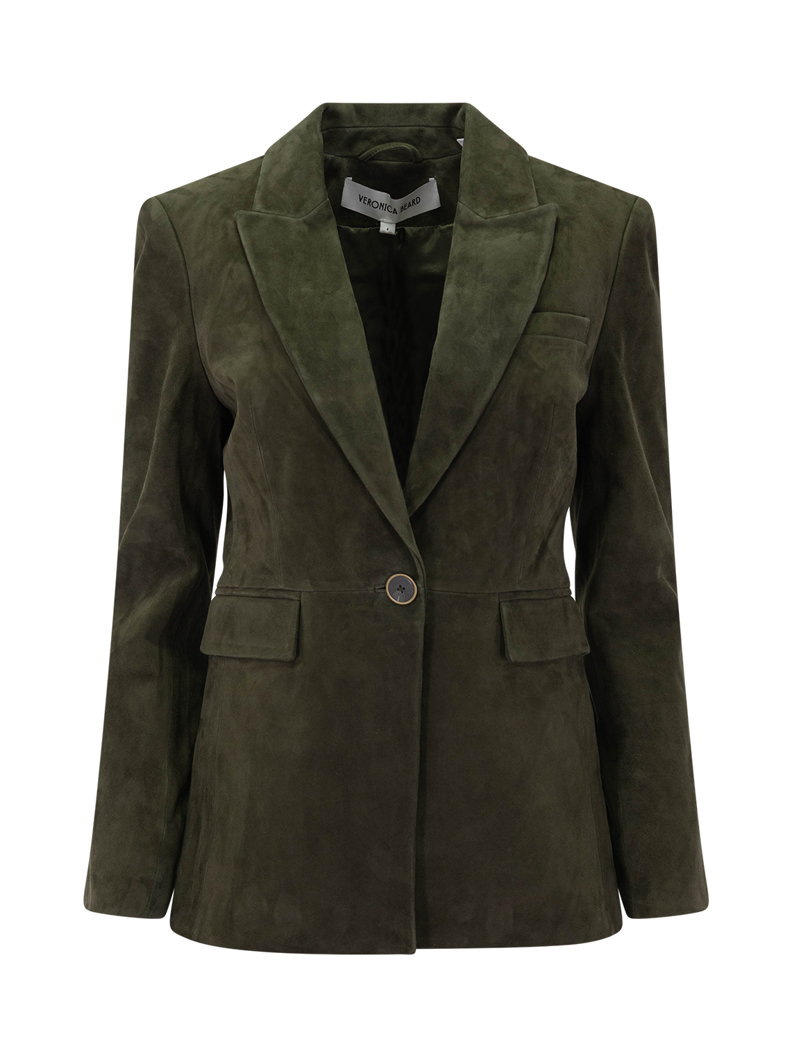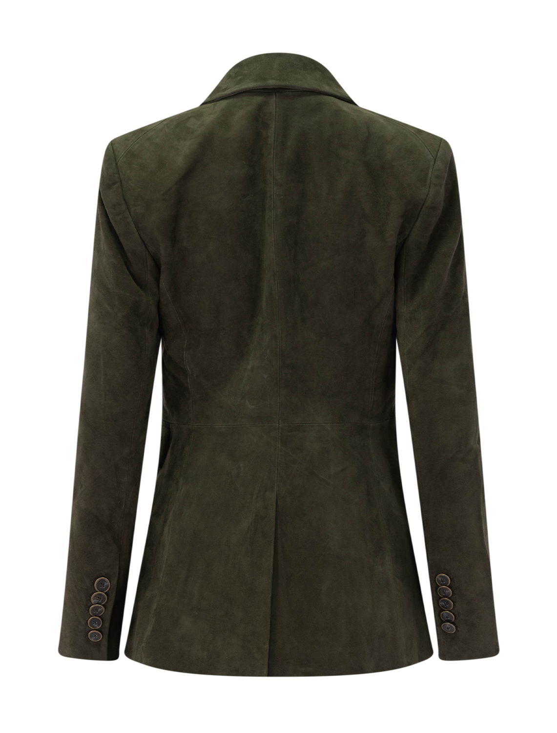 A luxe wardrobe staple you’ll reach for year after year. Expertly tailored for a lean, elongating fit, the Duane is the classic single-breasted blazer, reimagined in soft, velvety suede. A peak lapel, cutaway hem, and flap and welt pockets complete the look. Pair this dark green jacket with jeans and boots for a fall-ready look.