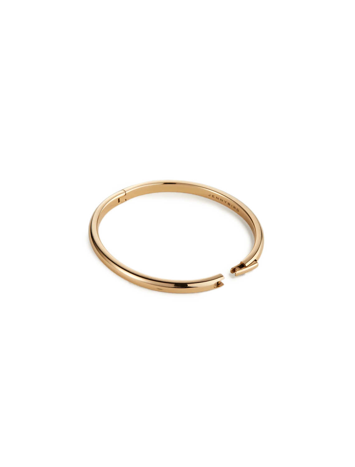This gold bracelet opens and closes with a hinge and tab lock closure. To open, push down on the highest point of the clasp before pulling the bangle open. To close, listen for a "click" to ensure tab is locked properly. Note: this design wears best when the closure is secured on the inside of your wrist. Finished in high-polish 14k gold.