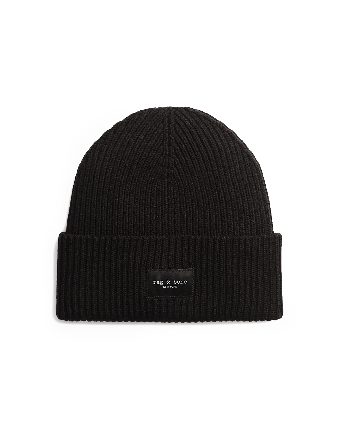 A cold-weather staple. Knit from a soft, extra-fine merino wool blend, this beanie hat is designed for a snug fit with a folded brim featuring a logo patch at the center.