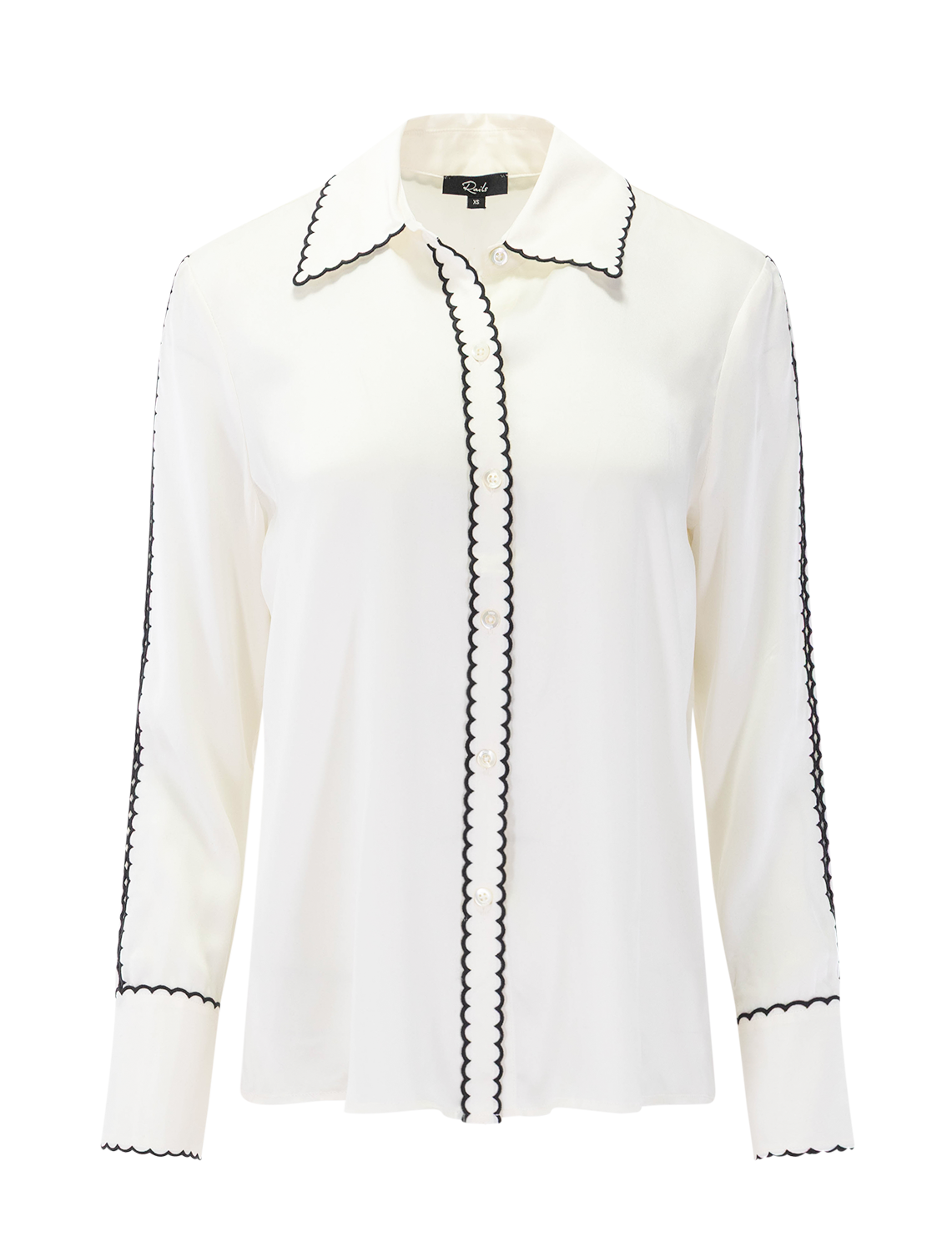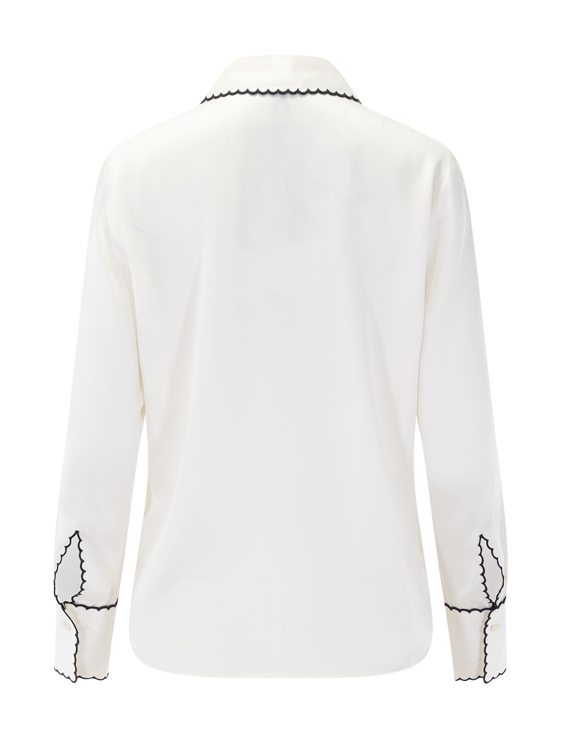 Sophisticated by design, the Aloise is a classic collared shirt in smooth, flowing silk charmeuse, featuring contrast scalloped embroidery with delicate cutouts on the sleeves and front button closures.