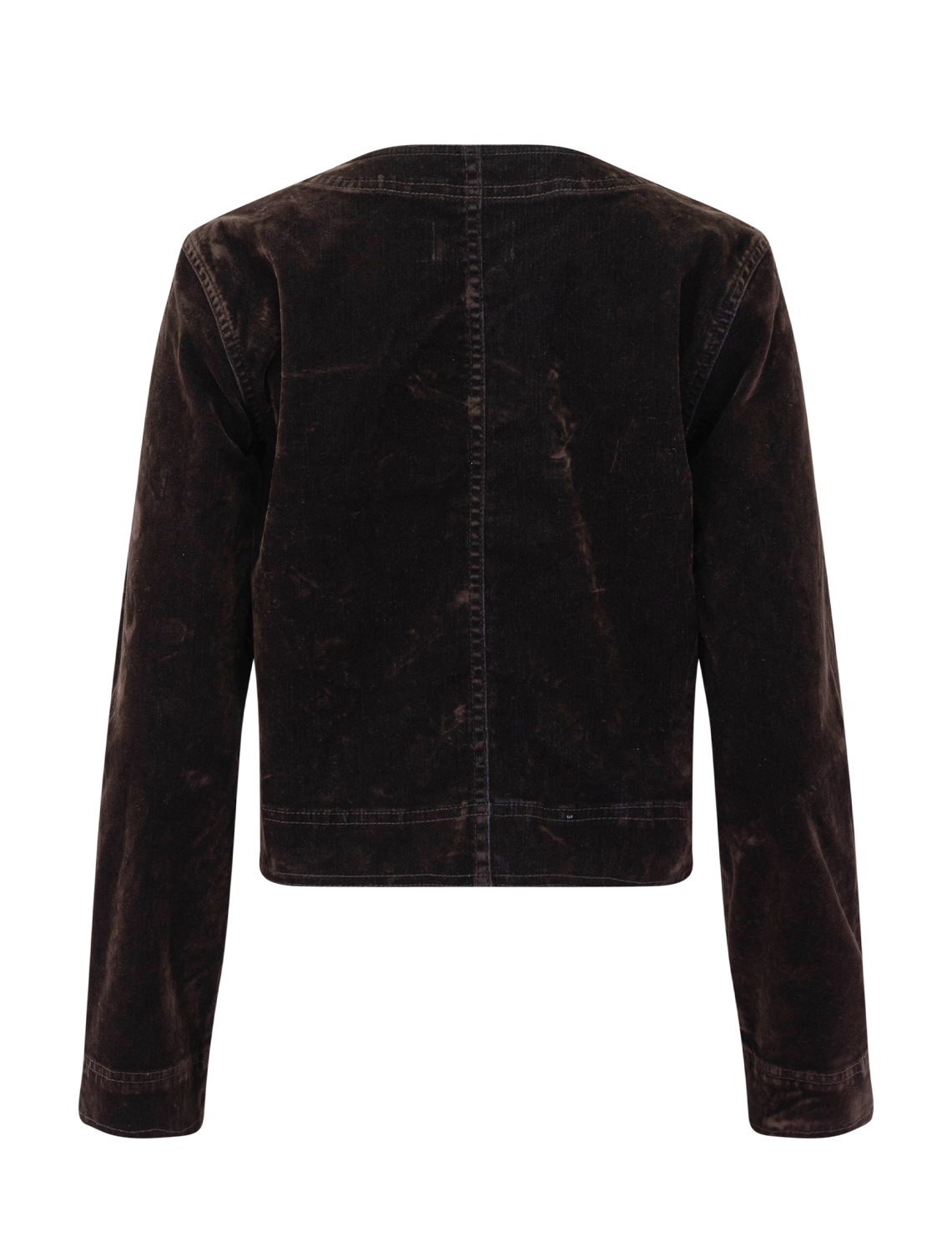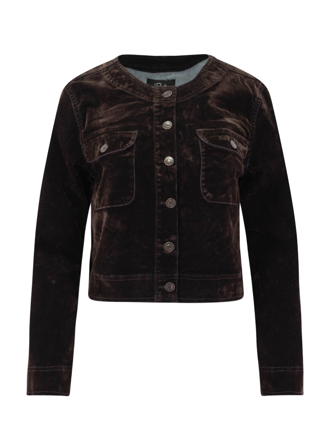 The Capistrano is a cropped, collarless 'lady' jacket with a boxy fit. Rounded studs at the hem and sleeves lend a little edge, and flap pockets finish the look.