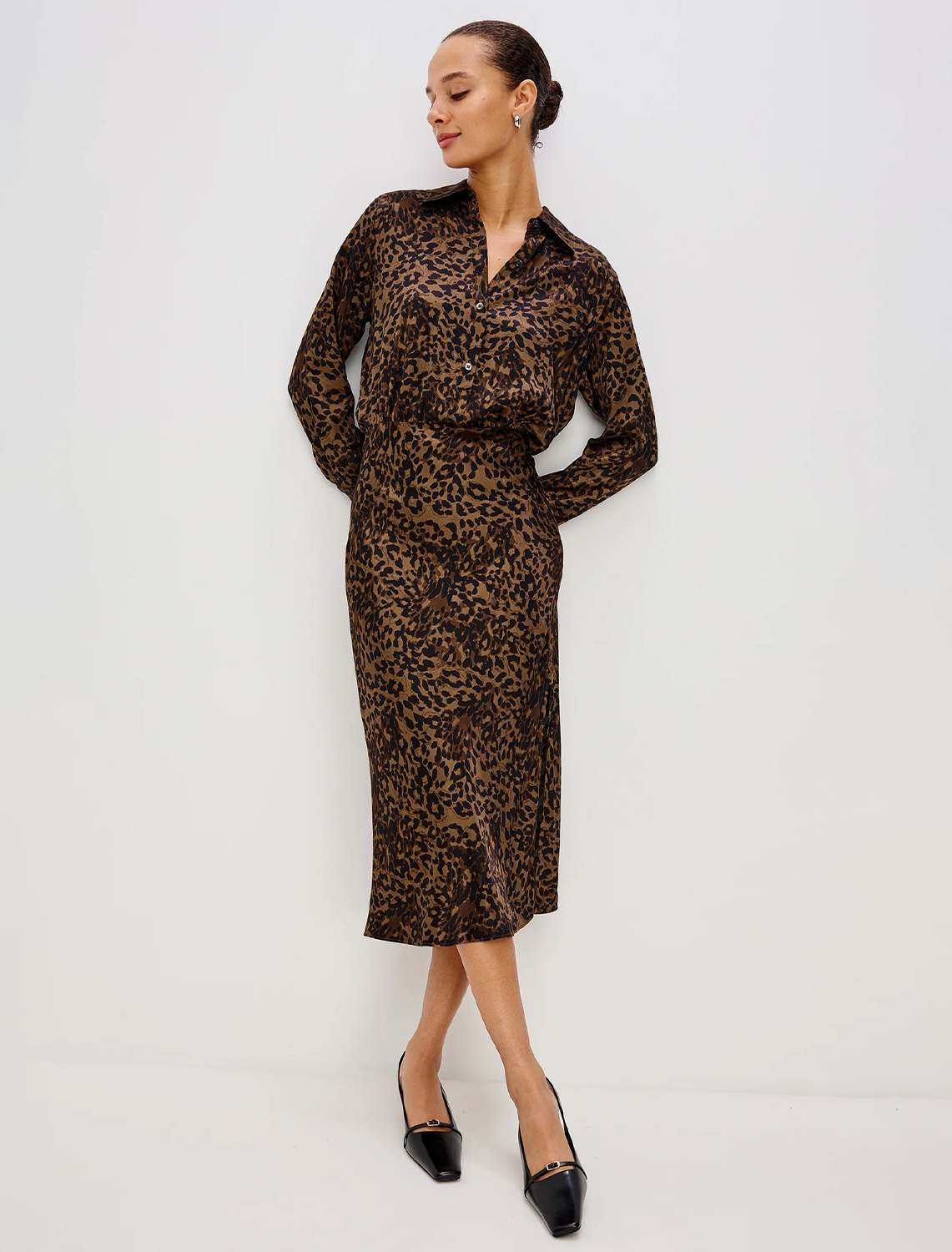 Designed for effortless movement, the Jazlyn features a lustrous leopard-print fabric, classic collar, long sleeves, and front half-placket, flowing into a bias-cut skirt for a refined, seamless silhouette.
