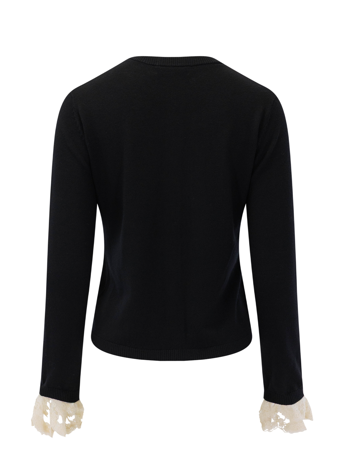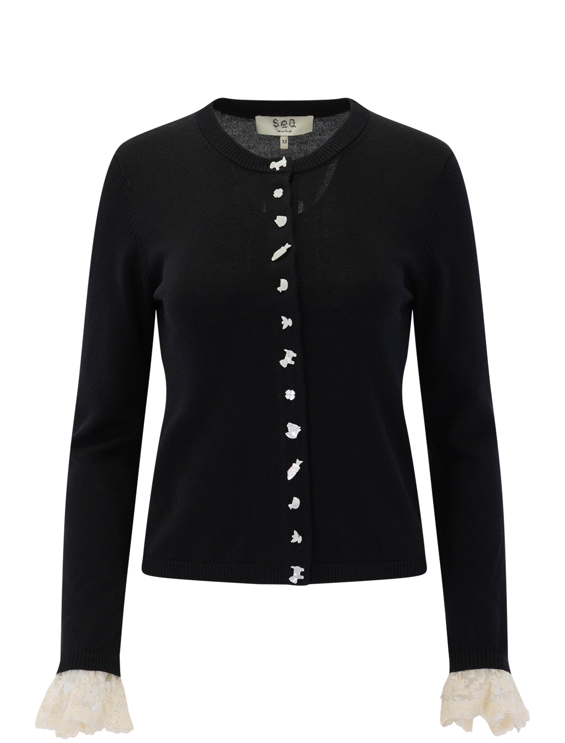 The Diane knit cardigan features intricate folkloric-inspired buttons and detachable lace cuffs, combining artisanal charm with versatile elegance.