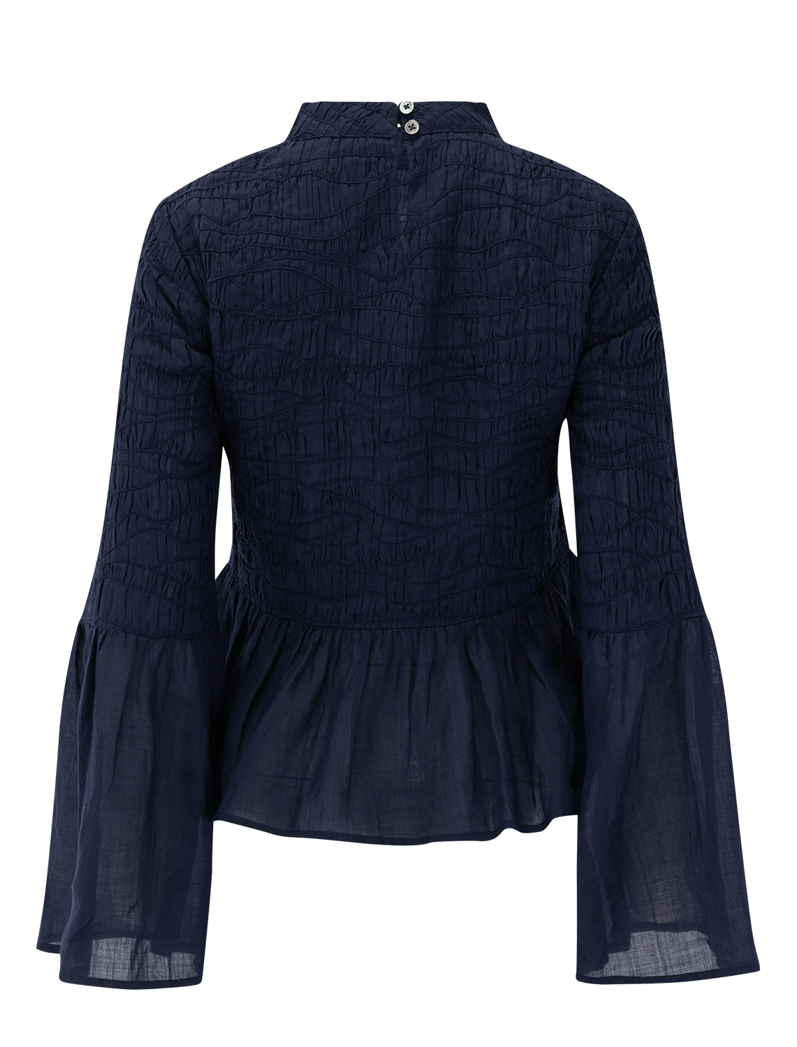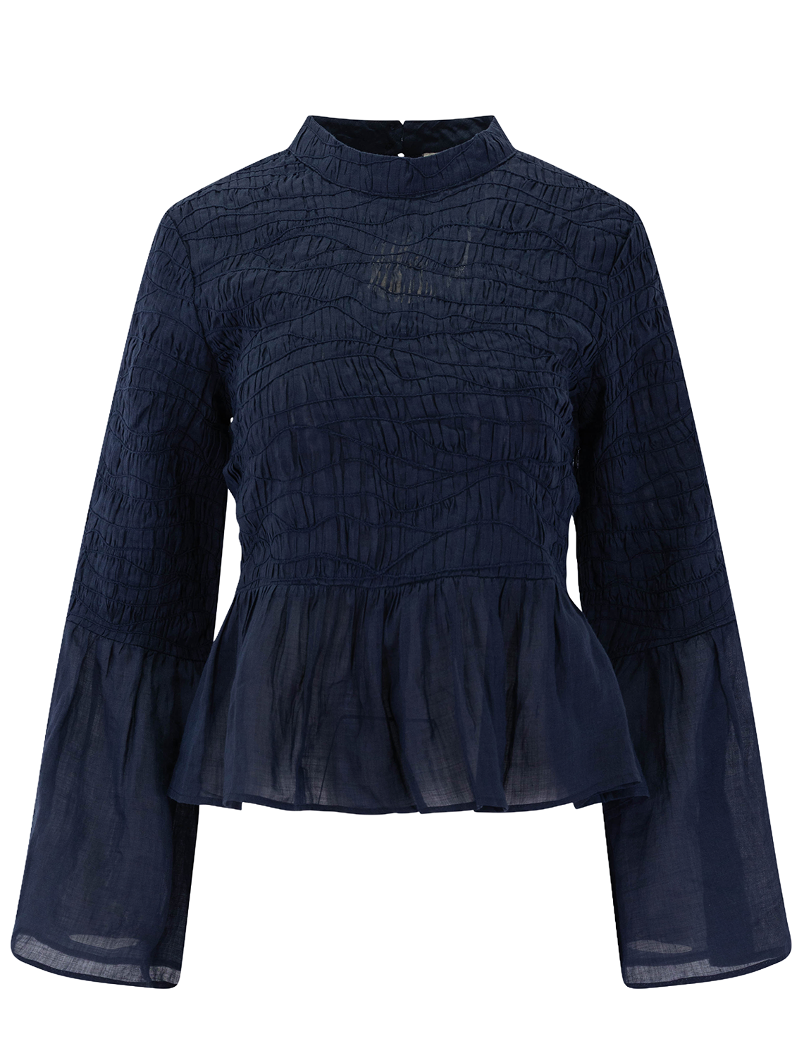 The Imogen long sleeve top features intricate pintuck detailing and a high neckline. Voluminous sleeves and a flared peplum hem create a romantic yet structured silhouette.