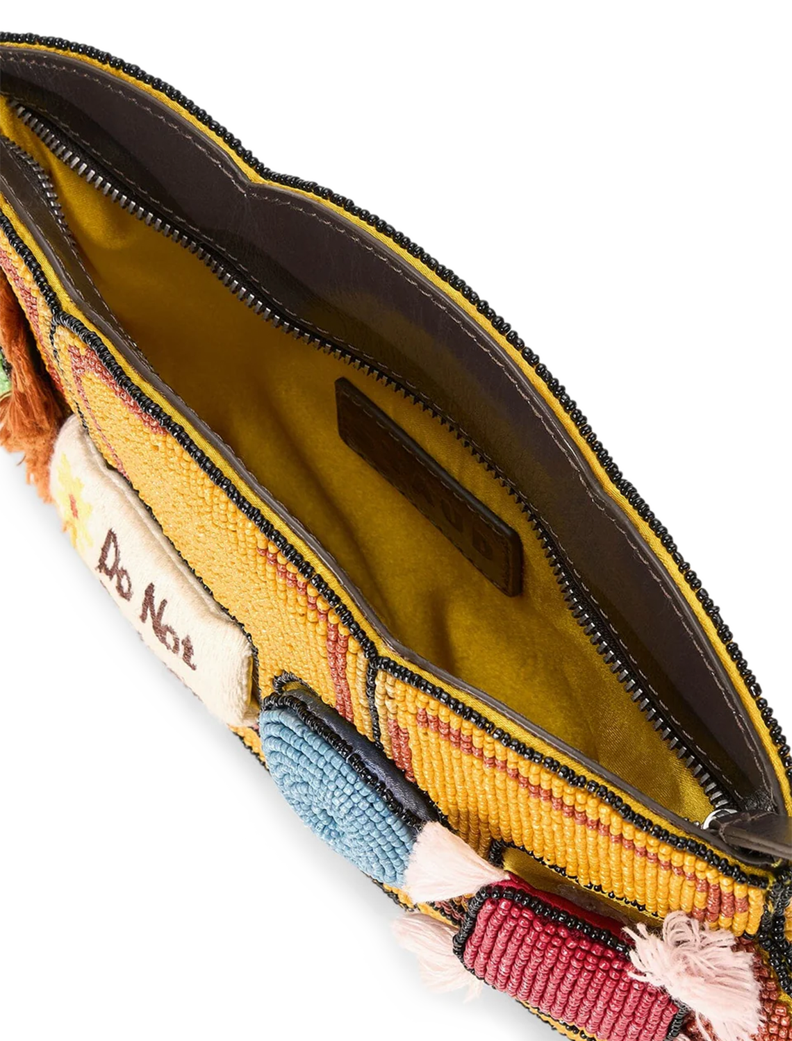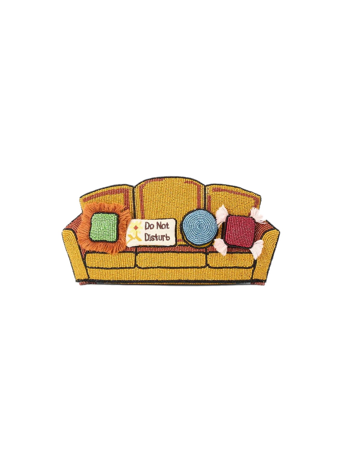 The ultimate conversation piece. This style is a hand-beaded clutch fashioned after a big cozy couch. Featuring a "Do Not Disturb" detail pillow.