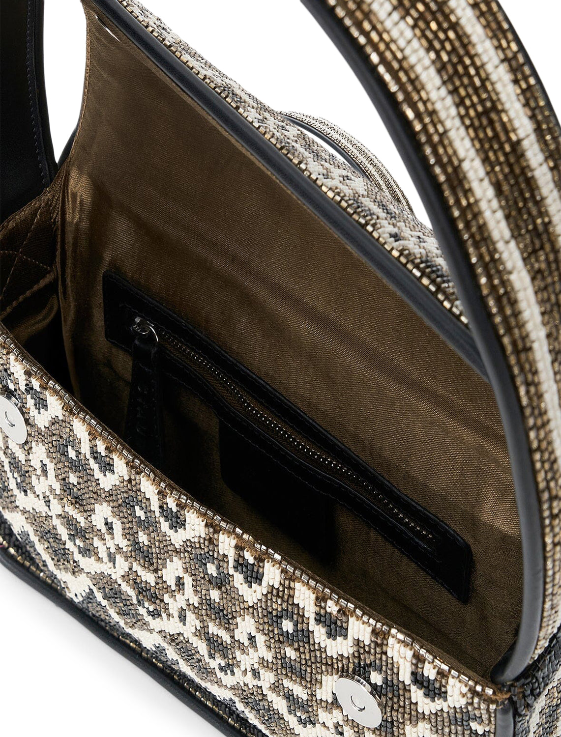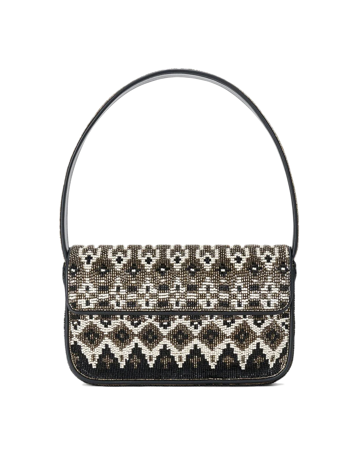 The latest limited-edition Tommy features a playful seasonal print. The Tommy Bag is a hand-beaded shoulder bag with vegan leather piping. This style features a single flap closure, inner zip, and a back slip pocket.