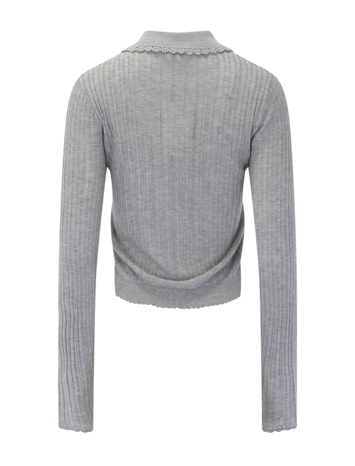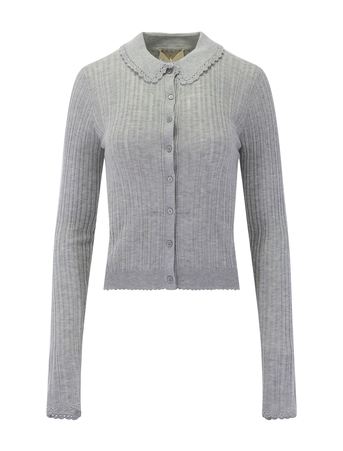 Elegant ease arrives in the Lottie Cardigan, knitted from a lightweight pointelle with openwork that subtly reveals. This long-sleeve, pristine white essential has a slim fit for layering, a classic collar, and is finished with delicate, hand-crochet trims at the edges for an artisanal touch. It fastens with tonal buttons through the front.